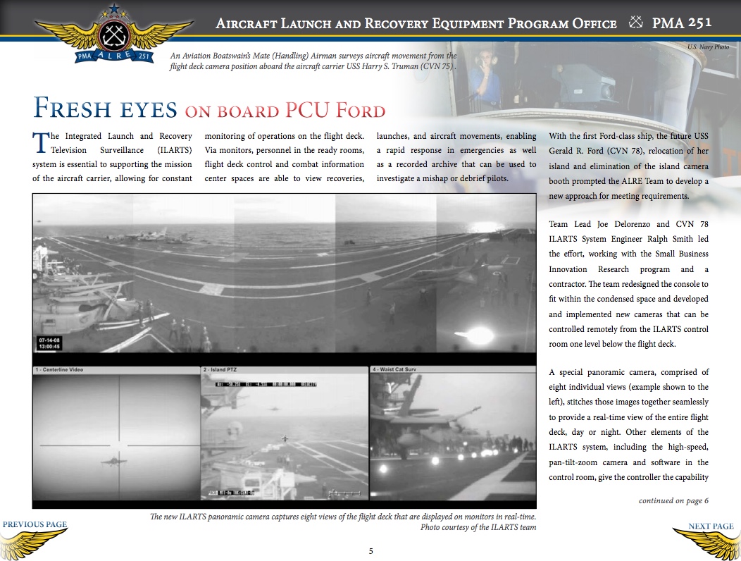 The Ford class supercarrier, with its smaller island superstructure, has totally eliminated the Island Camera Room and has replaced it with a distributed aperture remote video system. Called Digital ILARTS, this system does what the old manned camera couldn’t, it stares in every direction at all times.