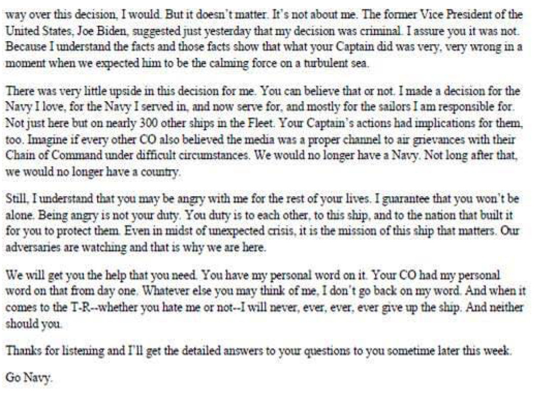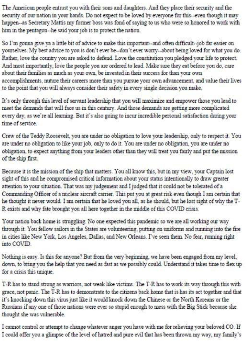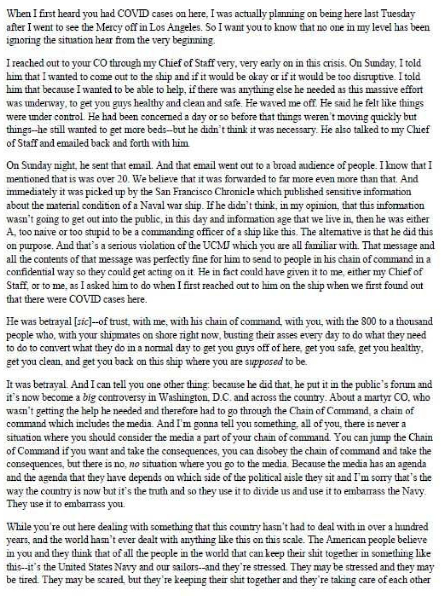 Acting Secretary of the Navy Modly has issued his own statement regarding the speech, which he says he stands behind. It’s hard to see Modly’s speech, and the idea that he expected it to remain “private,” as hypocritical given what he has said about Crozier’s letter and its contents.