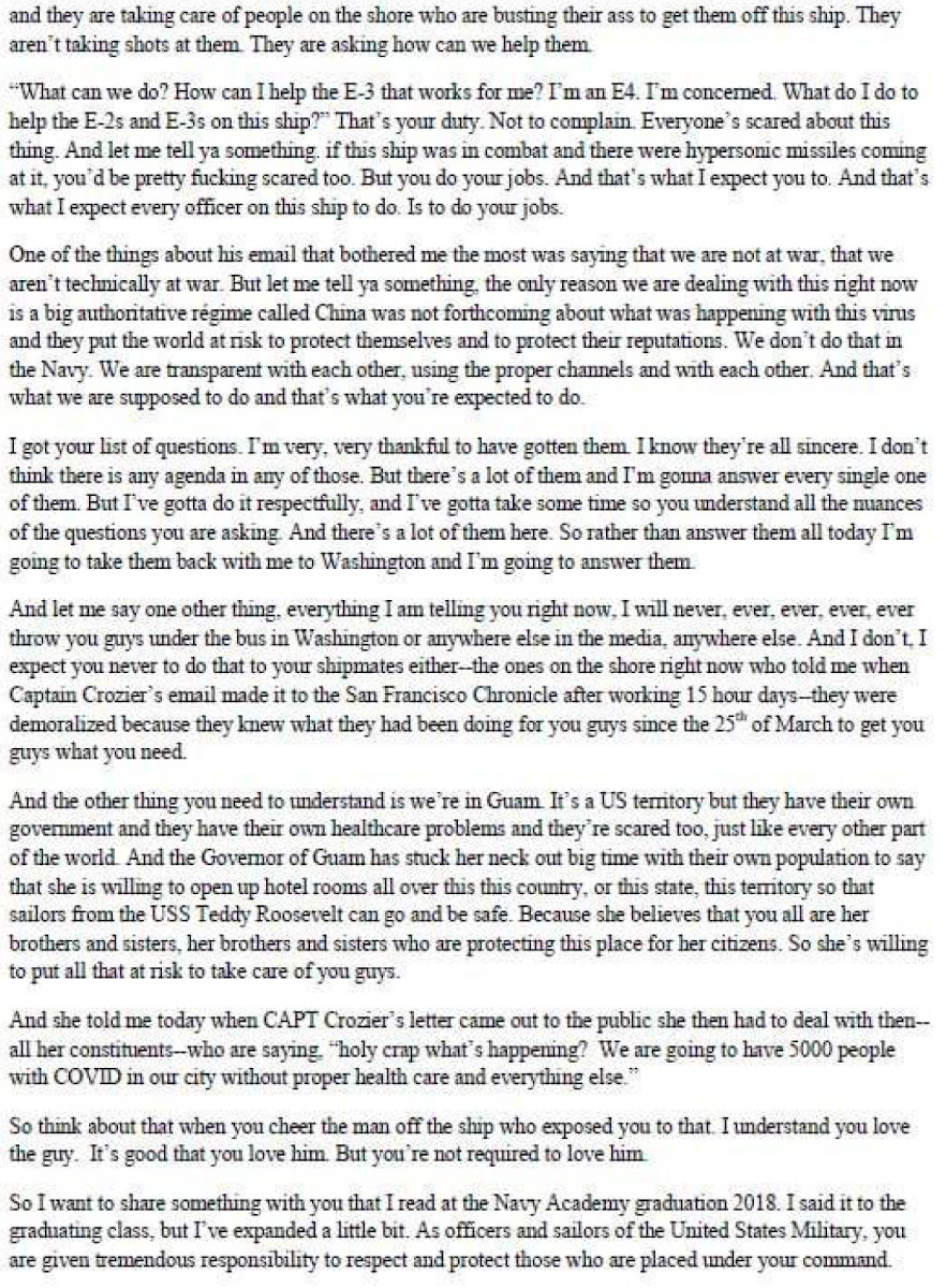 The Navy has issued an official response, stating that the transcript is not official and that Modly’s remarks were “intended to be private,” but not explicitly denying the transcript’s content or that of the audio that is now available online.