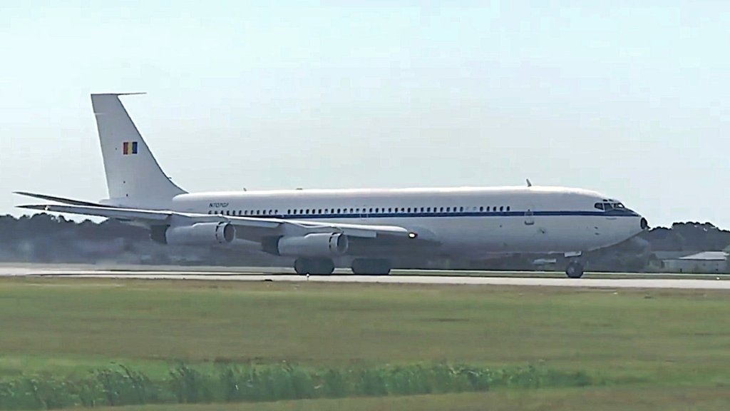was first to report that the 707, which carries the U.S. civil registration number N707GF, had left Brunswick Golden Isles Airport in Georgia, where it had been in storage, and was heading to San Antonio, Texas. The aircraft still has the overall white with blue cheatline livery, as well as Romanian national flag on the tail, that it did before Omega Air acquired it. The large “ROMANIA” titles that it previously had on either side of the forward fuselage have been removed.
