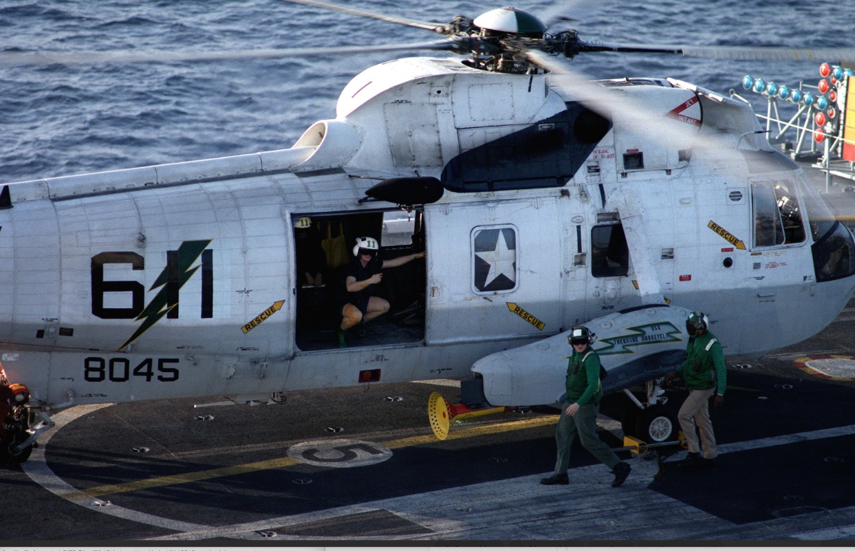I watched this drama unfold from the safety of the ready room, of course. We weren’t allowed to go on deck because of the 70 knot winds. It was stunning to see the aircrew and maintenance personnel fight just to get to the spots on the waist where their birds were tied down. The pilots masterfully got the engines and rotors started and lifted off to save those folks. Once on scene, the helo AWs then jumped into those 35-foot seas!