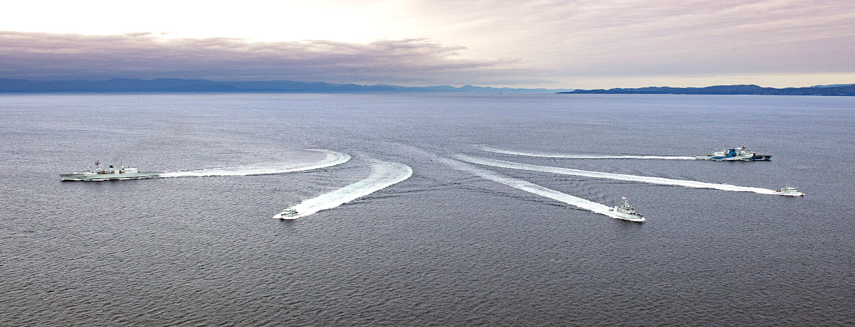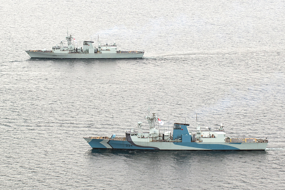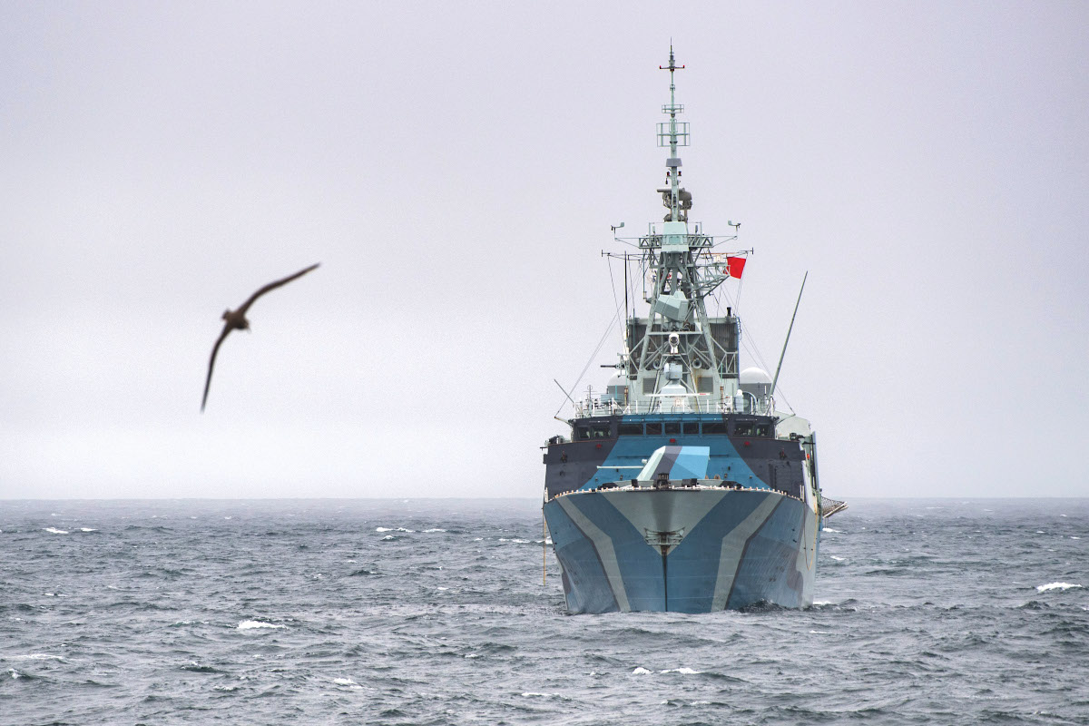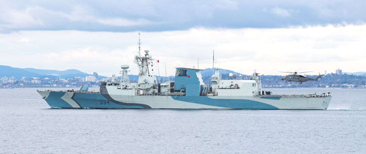 At the end of March 2020, Regina, and her unique paint job, had joined HMCS Calgary, another Halifax class frigate, along with the Kingston class coastal defense vessel HMCS Brandon and two Orca class Patrol Craft Training (PCT) vessels, Cougar and Wolf, for Task Group Exercise 20-1 (TGEX 20-1) off the coast of Vancouver Island in the northeastern Pacific Ocean. The training continued into the first week of April. TGEX 20-1 was part of Calgary‘s Directed Sea Readiness Training (DSRT) in preparation for that particular ship’s upcoming deployment.