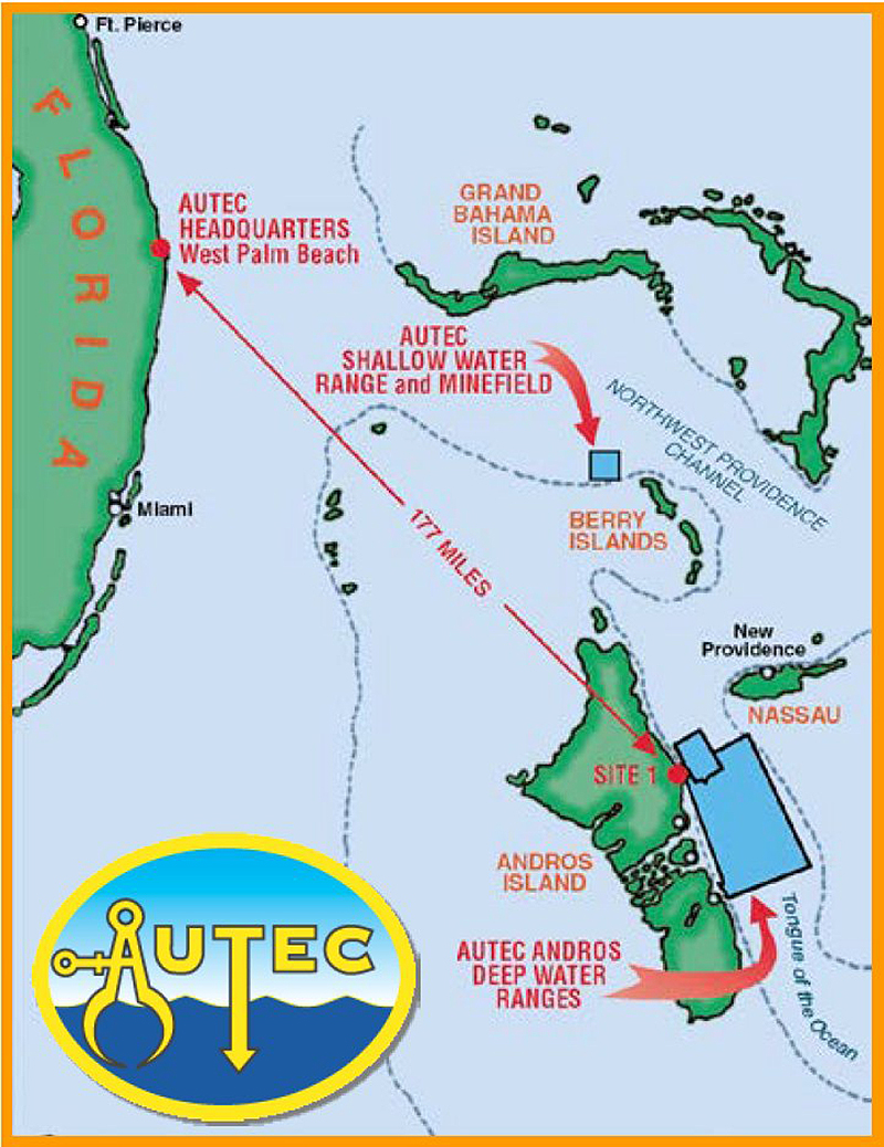 The Bahamas are home to white beaches, sun-scorched tourists, towering cruise ships, and the United States Navy’s most advanced weapons and sensor testing range. Beneath the revealing party goers dancing on the lido deck, submarines sail quietly through the Northeast Providence Channel into a secure area called the Atlantic Undersea Test and Evaluation Center, or AUTEC.