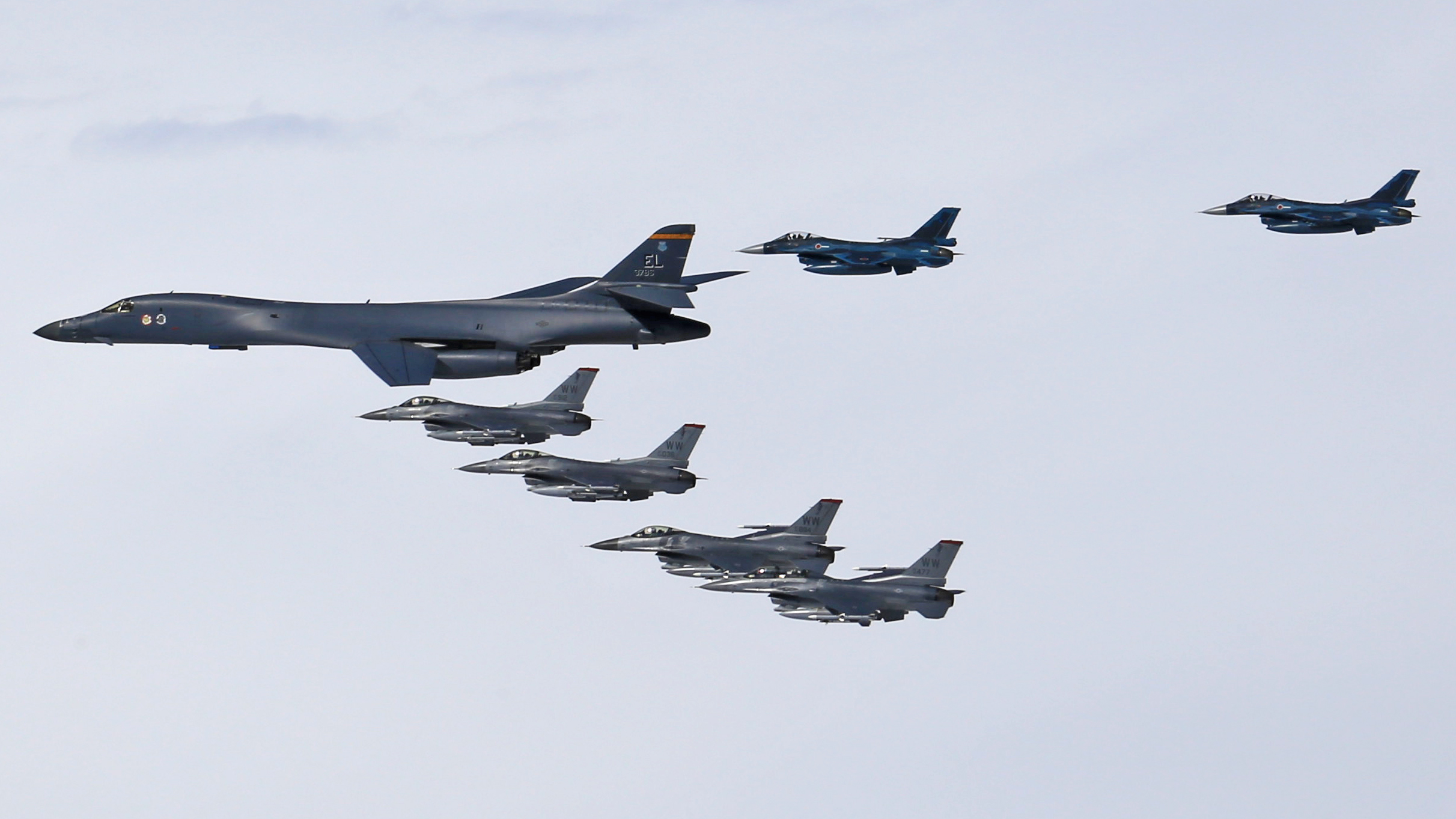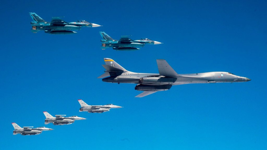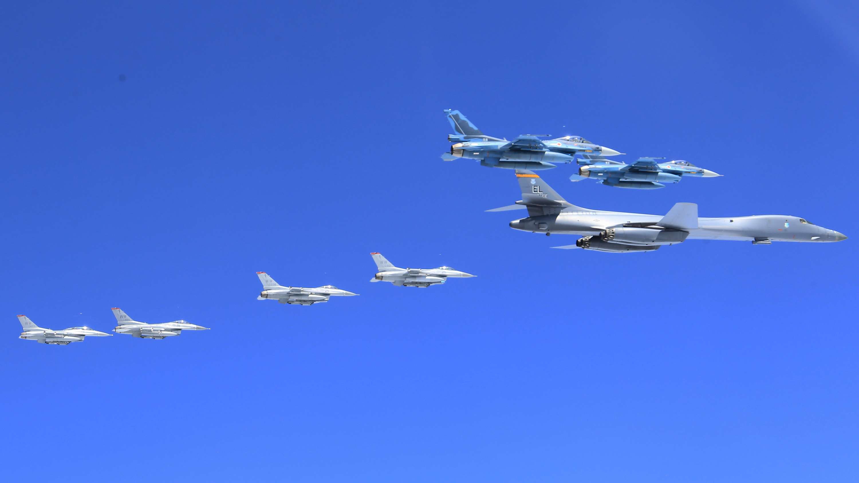 The B-1 is assigned to the 28th Bomb Wing and the F-16s are assigned to the 35th Fighter Wing from Misawa Air Base, Japan.