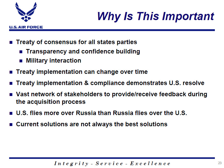 The agreement is intended to enable signatories to conduct largely unfettered flights over the territory of other members to broadly observe military activities. The process by which these flights are scheduled and monitored is heavily regulated. The underlying goal is to promote transparency and reduce the chances of dangerous misunderstandings, such as a military exercise being misinterpreted as a prelude to an invasion. The Treaty entered into force in 2002 and there are now 34 states signed up to it, including the United States and Russia.