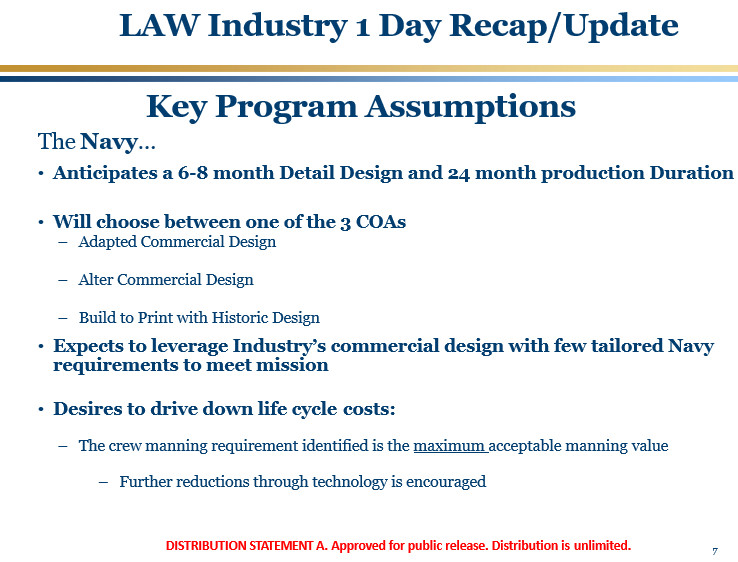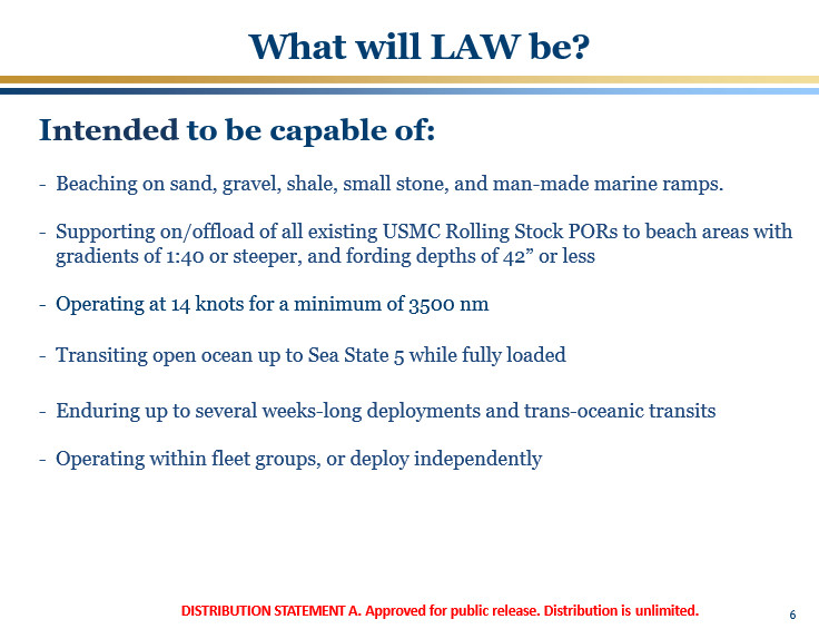 “Evolving threats in the global maritime environment causing the Naval Forces to re-evaluate/adjust their CONOPs [concepts of operation] to meet the new challenges associated with maintaining persistent Naval forward presence to enable sea control and denial operations,” is how PMS 317 described the underlying need for the new class of amphibious ships at the April briefing. The LAW is “intended to provide Naval Forces the maneuver and sustainment vessels to confront the changing character of warfare.”