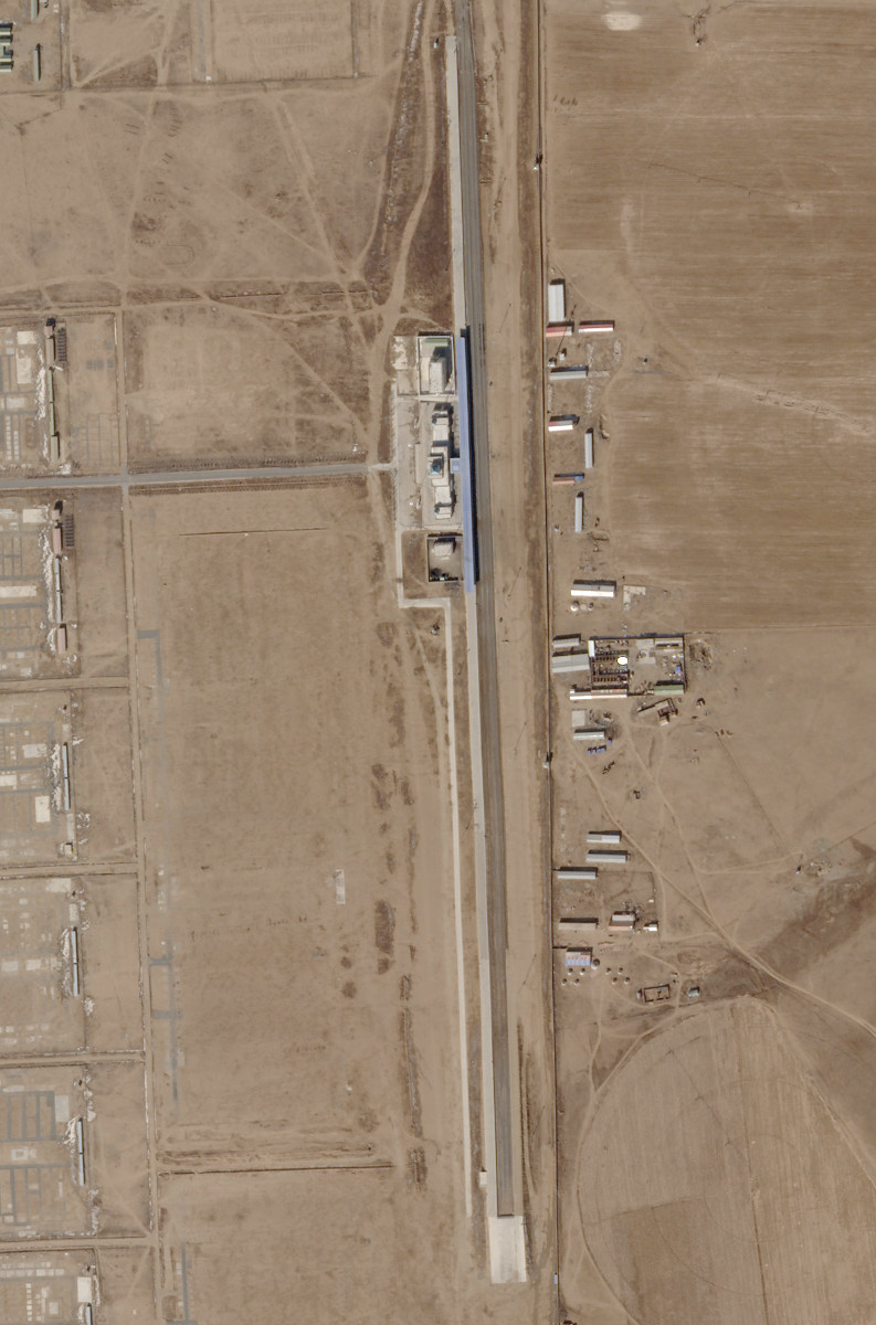 Further to the south, beyond Zhurihe’s Taiwan-related structures, is a mock air base, the initial iteration of which was completed between 2013 and 2014. At that time, it had a runway around 3,900 feet long and two separate aprons, as well as various small structures. In 2017, extensions were made the runway at both ends, bringing it to around 10,105 feet. Gates are now in place that can close off these additions from the main portion of the runway and there are a number of more austere aprons along the northern end.