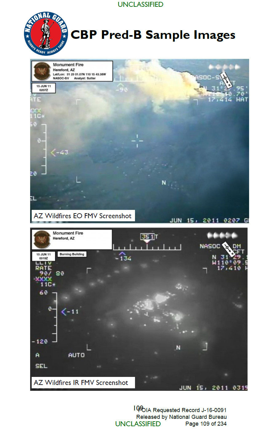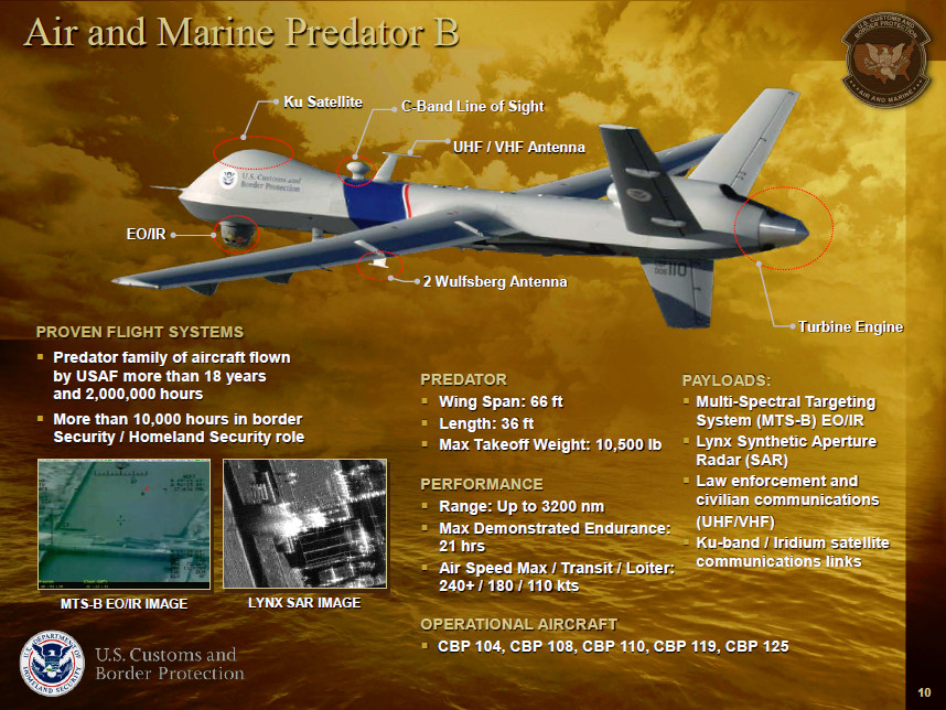 The drone’s callsign, CBP 104, identifies it as one of CBP’s older Predator B types, which are configured for overland surveillance. The primary sensors on these drones are electro-optical and infrared full-motion video cameras in a turret under the nose, though they can also capture still imagery using the Lynx synthetic aperture radar. They also have data links capable of sending this video and imagery back to control stations on the ground in near real-time.
