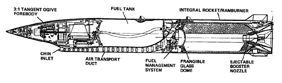 The Air Force ultimately settled on some form of rocket ramjet as the desired propulsion method. ASALM used a rocket ramjet configuration in which a rocket booster propels the overall system to an optimal speed for a air-breathing ramjet engine to takeover. The empty rocket motor casing serves as the combustion chamber for the ramjet.