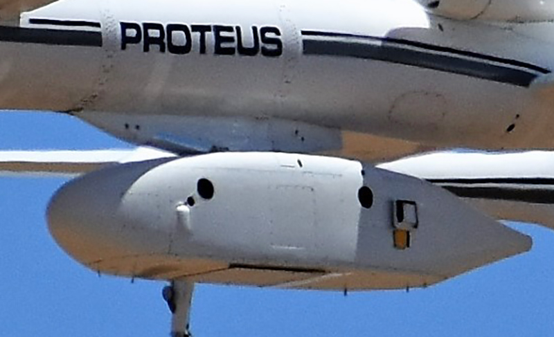 This week, the trio of highly experimental aircraft were airborne once again over and near the Navy’s massive Naval Air Weapons Station China Lake range complex in the Mojave Desert. Proteus and one of the Model 401s sortied from Scaled Composite’s home base at Mojave Air and Space Port, while the other Model 401 flew out of China Lake, just like last time. But this time around they were joined by another player, a NASA F-15D Eagle carrying a large pod.