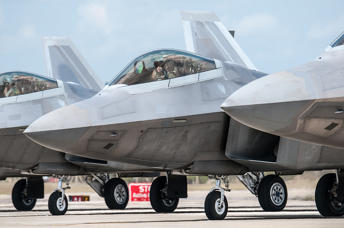 A Raptor pilot explained how the various types of aircraft worked together: “Fighter Integration (FI) tactics focuses on the synergistic effects that can be harvested by successfully playing to each fighter type’s strengths, while avoiding, as a package, individual aircraft type’s potential weaknesses. As an example, during an Offensive Counter-Air focused training mission, the F-15Cs integrated with F-22s to gain air dominance against an advanced air-to-air fighter threat, allowing the F-15Es to roam freely across the battlespace and further integrate with F-22s to find, fix, target, track, engage and assess both medium and long-range Surface-to-Air Missile (SAM) sites in a contested Integrated Air Defense System (IADS) environment.” Hot stuff!