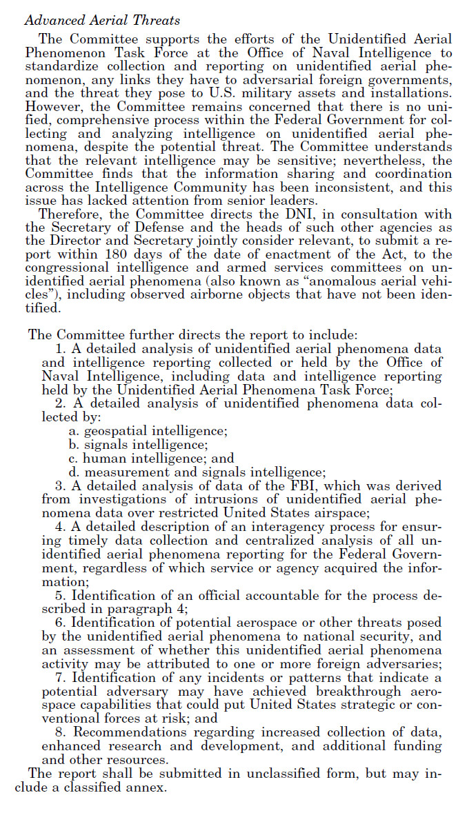“The Committee supports the efforts of the Unidentified Aerial Phenomenon Task Force at the Office of Naval Intelligence to standardize collection and reporting on unidentified aerial phenomenon, any links they have to adversarial foreign governments, and the threat they pose to U.S. military assets and installations,” the committee report says. “However, the Committee remains concerned that there is no unified, comprehensive process within the Federal Government for collecting and analyzing intelligence on unidentified aerial phenomena, despite the potential threat. The Committee understands that the relevant intelligence may be sensitive; nevertheless, the Committee finds that the information sharing and coordination across the Intelligence Community has been inconsistent, and this issue has lacked attention from senior leaders.”