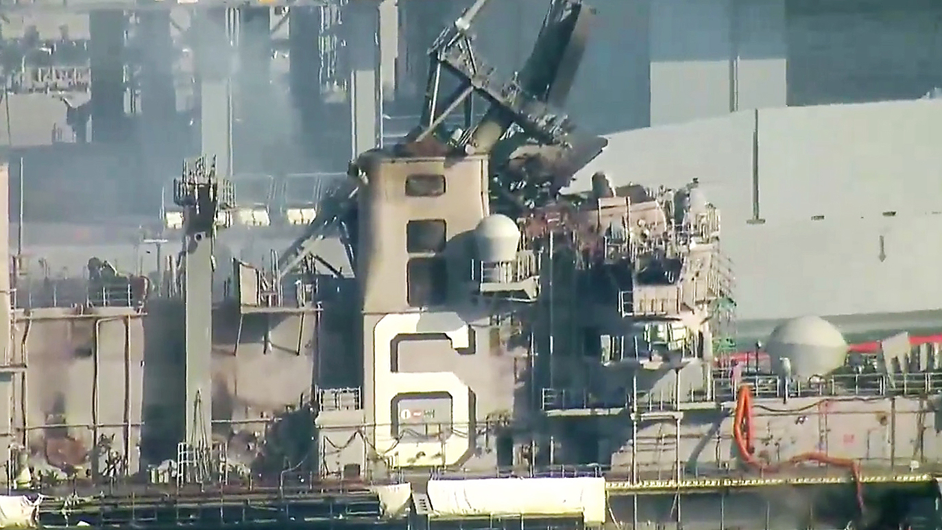 Rear Admiral Philip Sobeck addressed reporters at 11:00 AM local time in San Diego to provide new information on the ongoing fire aboard the amphibious assault ship USS Bonhomme Richard (LHD-6) that has now burned continuously for 27 hours. The press conference follows a terrible night for the ship, which saw the fire expand to its bridge and greater island superstructure, partially melting its upper forward portion. The ship now lists at the pier as firefighting efforts continue at a frantic pace from both the air and the ground.