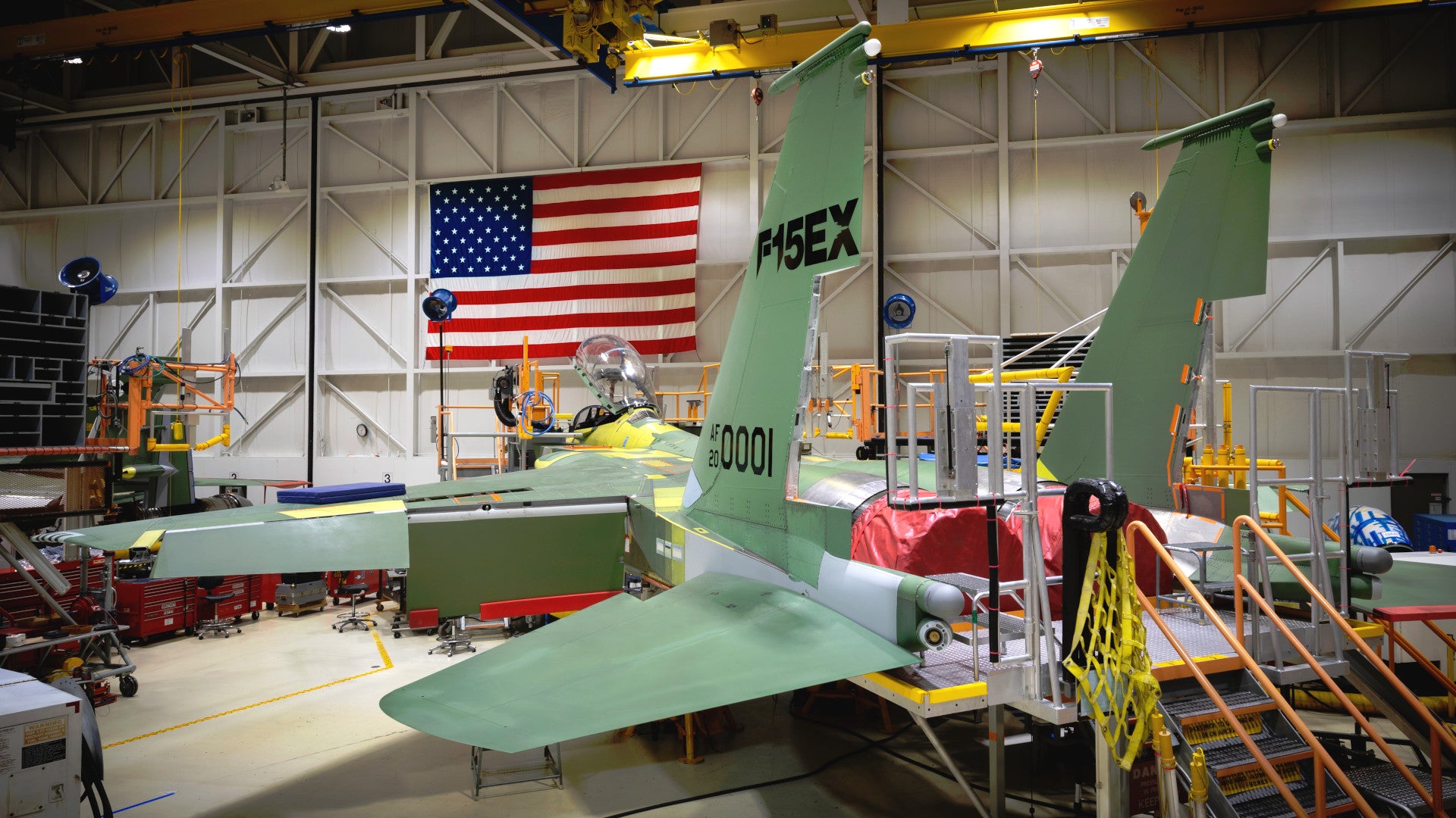 The Air Force has released the first picture of one of its new Boeing F-15EX Eagle fighter jets now under construction. This coincides with the service awarding the Chicago-headquartered plane maker a contract worth nearly $23 billion for work on these jets, $1.2 billion of which will go to the delivery of the first lot of eight aircraft.