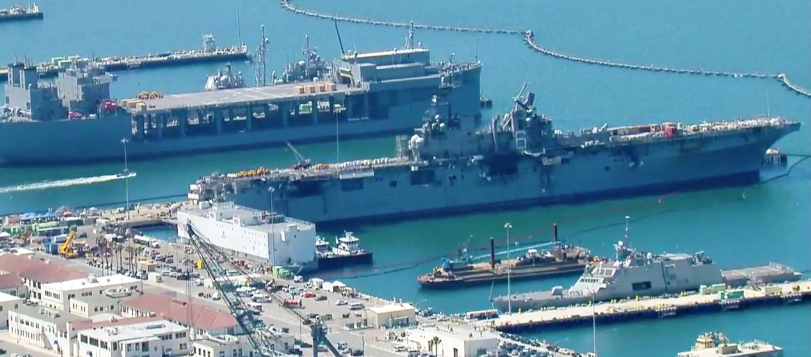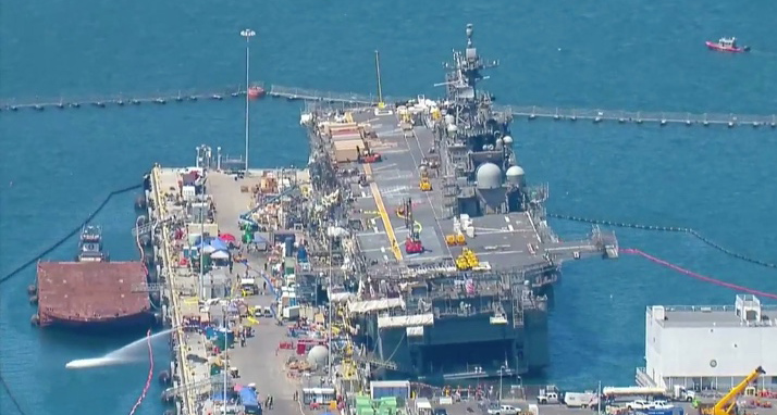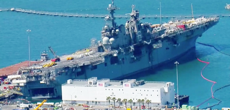 Bonhomme Richard had begun listing to starboard on July 13th and that list only increased until being brought under control recently. Now it looks like the ship has listed to port, toward the pier, which triggered the evacuation as the fire approaches the four-day mark. Chris Cavas corroborated the ship’s list to port using local harbor cameras: