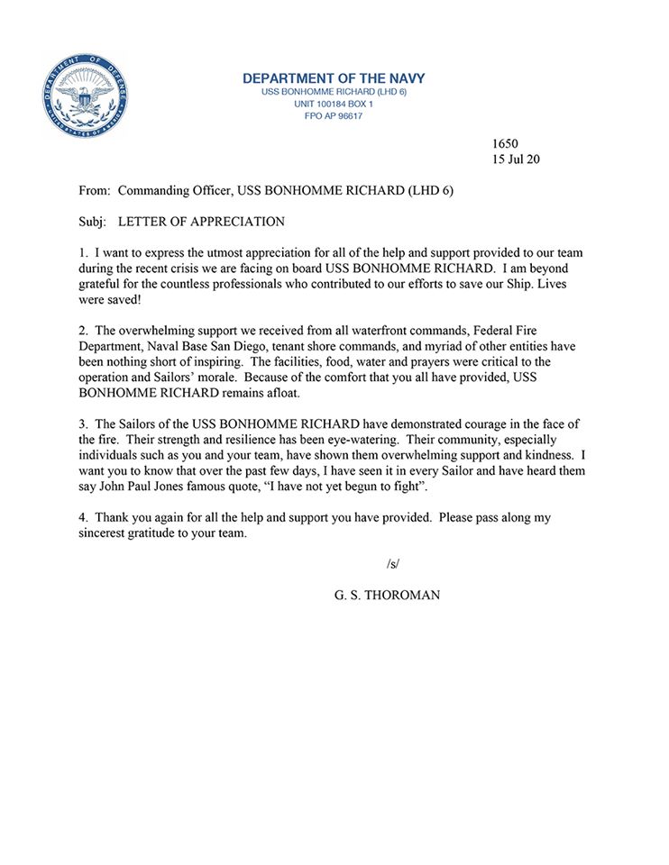 Letter of appreciation from the Bonhomme Richard’s CO: