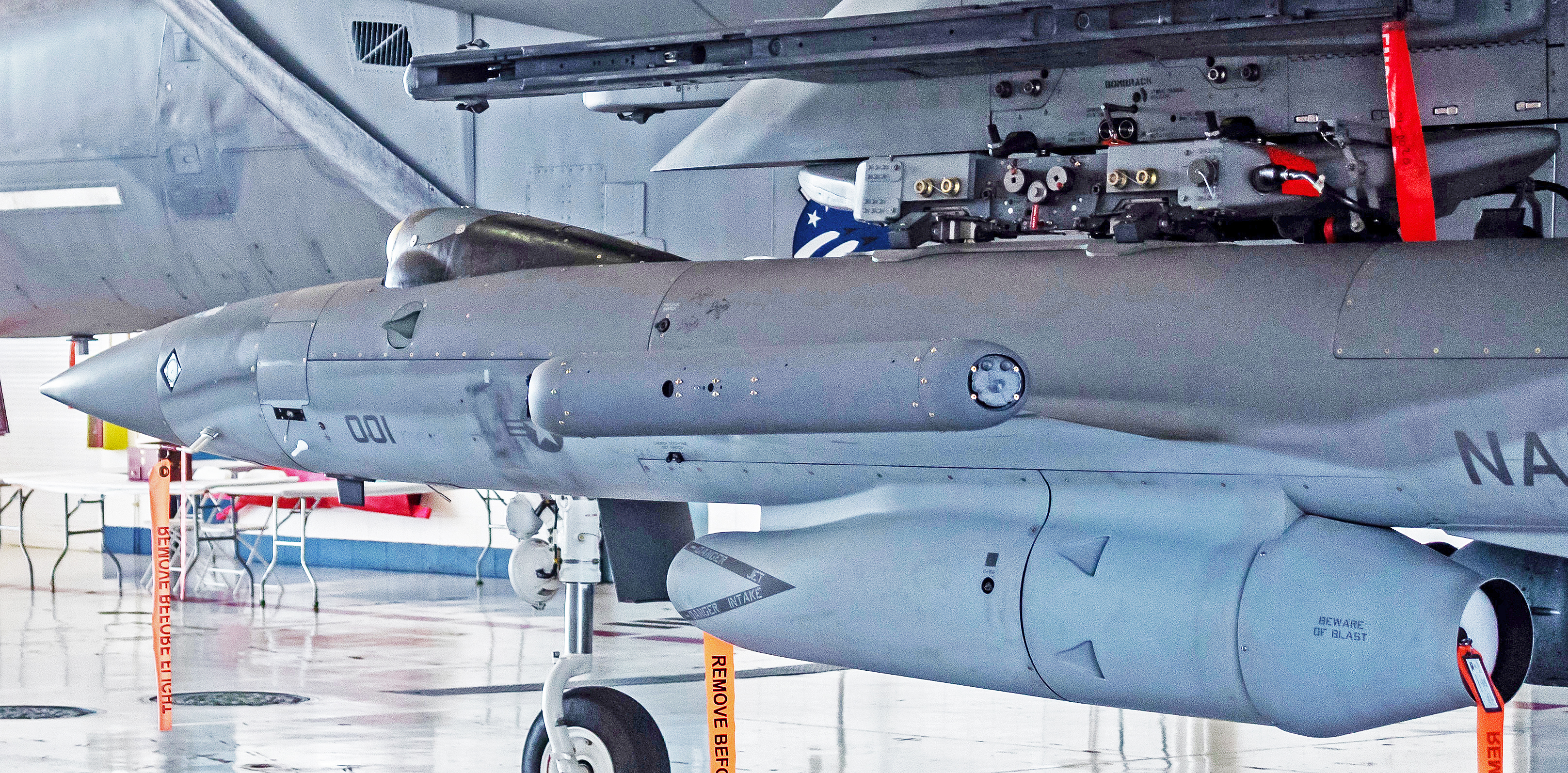 UAE’s Block 60 F-16E/F Desert Falcons have a similar system installed on their noses, although the concept dates back to the 1980s in the guise of Falcon Eyes infrared sensor. You can read all about the UAE’s system and Falcon Eyes in this piece of ours. Generally speaking, imaging infrared sensor systems can have gold-colored opaque glass enclosures that they peer through. The AGM-65D/G Maverick or the LANTIRN system’s navigation pod are good examples of this. On the other hand, the enclosure could be a solid metallic golden finish, with the sensor swiveled inward at the time the photos were taken.