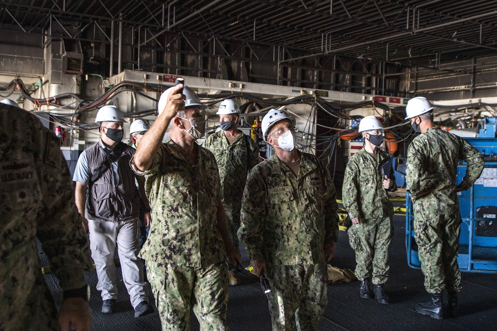 “There is fire and water damage, to varying degrees, on 11 of 14 decks,” Gilday, who visited Bonhomme Richard on July 17, wrote in the letter Defense News obtained. “With the flight deck as a reference, I walked sections of the ship 5 levels below and had the opportunity to examine the superstructure.”