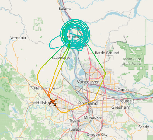The aircraft, which carries the U.S. civil registration code N645HM and is also known by the nickname Cougar, had first arrived at Hillsboro Airport outside Portland on July 19, 2020. The plane flew patterns for three days straight, but was never actually over downtown Portland, where protests are occurring, for any protracted period of time. It left the area today for Denver, Colorado, another area where it had been observed flying similar orbits last week.