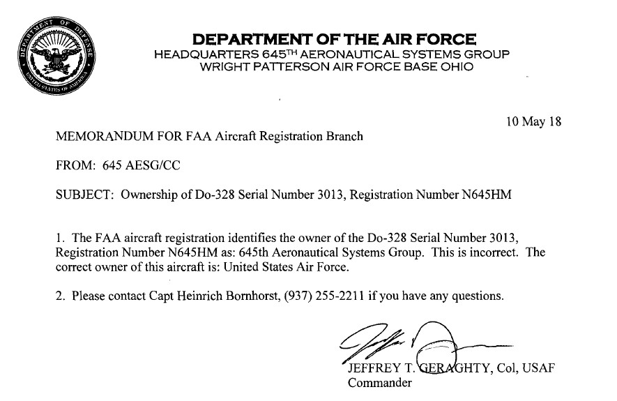 Not much is known about N645HM, which the Sierra Nevada Corporation (SNC) sold to the Air Force in 2014, or its specific activities, in general. The fact that it is known that it belongs to Big Safari at all is something of a clerical error. SNC listed the 645th AESG the buyer in the official bill of sale that it sent to the Federal Aviation Administration (FAA). In 2018, officials at Wright-Patterson Air Force Base in Ohio, where the group is headquartered, tried to get it changed to simply “United States Air Force,” but the FAA said they would need to submit a revised bill of sale, according to documents the author obtained via the Freedom of Information Act (FOIA). The Air Force appears to have dropped the issue and renewed the plane’s registration just this year without making any changes to the information about who actually owns the plane.