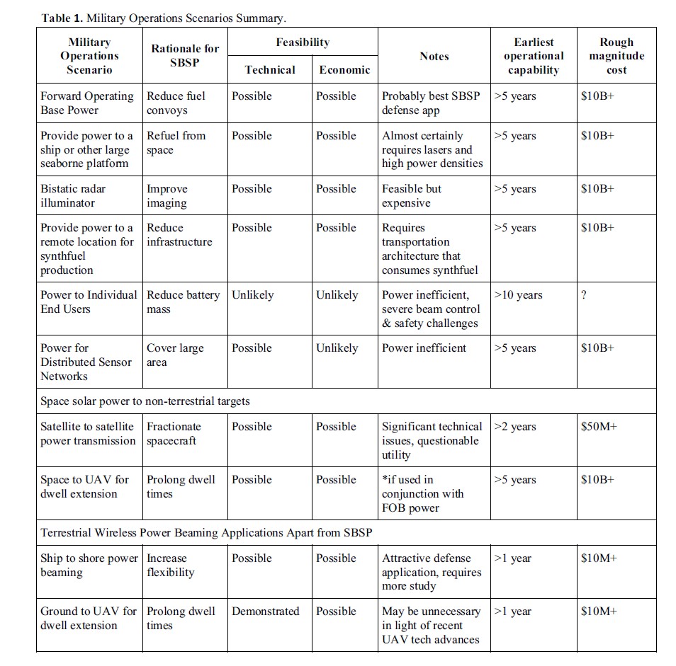 There are many other defense-oriented applications envisioned by the NRL. In 2010, Jaffe published the study “Defense Applications of Space Solar Power” in the Space, Propulsion & Energy Sciences International Forum hosted by the American Institute of Physics. In the paper, Jaffe presents a wide variety of defense applications that space-based solar power (SBSP) could augment, including providing power to a number of different installations, vessels, or distributed sensor networks, and even serving as a bistatic radar illuminator. As we cited in our previous reporting, Jaffe’s 2010 research also claimed that SBSP could be used in satellite-to-satellite power transmission or to provide UAVs with greatly extended endurance.
