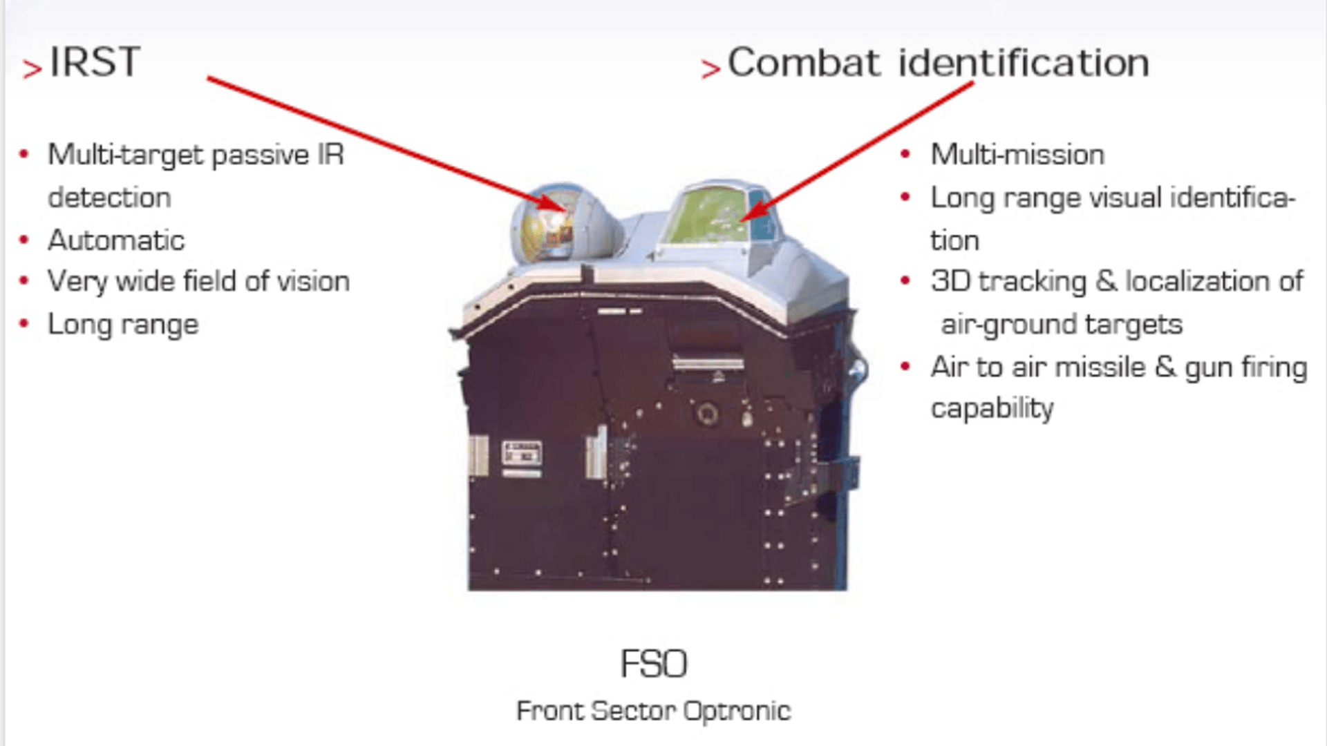 Indian Rafales feature an improved version of the Thales Front Sector Optronics (FSO) system, which includes SAGEM infra-red search-and-track (IRST). They also feature the Elbit Display and Sight Helmet (DASH), a modified radar altimeter for flying in mountainous terrain, plus a cold start engine capability for high-altitude airfield operations. They also include software modifications for the RBE2 active electronically scanned array (AESA) radar.