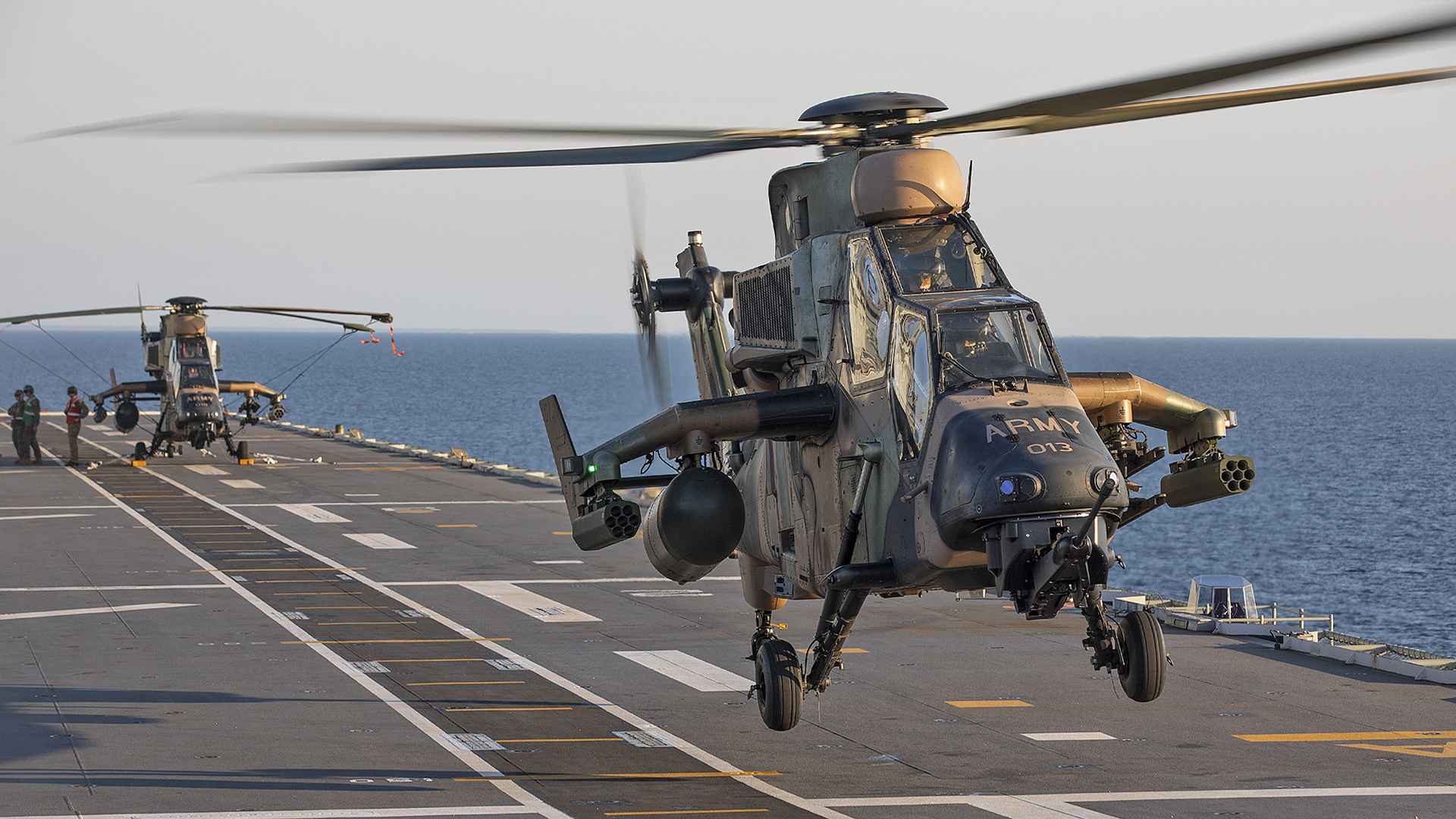 Australia chose the Tiger to fulfill its Armed Reconnaissance Helicopter requirement back in 2001, acquiring 22 examples. While the first two were handed over in December 2004, final operational capability (FOC) was only achieved in April 2016. The Australian Tiger took part in an overseas deployment for the first time last year, when four examples were airlifted to Subang in Malaysia on a Royal Australian Air Force C-17A, before embarking for training exercises aboard Canberra.