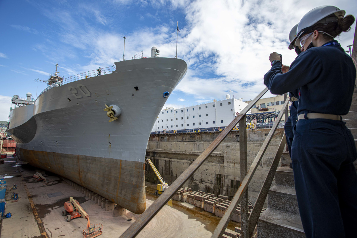 The photo was taken while Mount Whitney was in dry dock in San Giorgio Del Porto in Genoa, Italy. The ship is homeported there as the flagship of the U.S. 6th Fleet. You can read all about these old, but increasingly capable 620 foot-long ships in these past