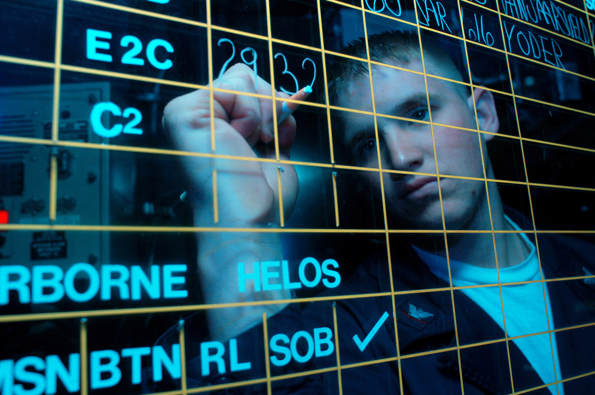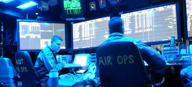 AIROPS is the carrier’s hub for all night flying activity. There are two status boards in AIROPS: one that tracks every plane launched and one that tracks every plane about to recover. Fuel states, aircraft mission, pilot names, aircraft side numbers, landing attempts and any miscellaneous information is displayed on these status boards, which is then piped through the ship’s internal TV system for everyone to see.
