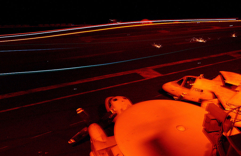 There are four arresting wires on Nimitz class ships. An arresting hook from the respective aircraft catches one of the four wires, bringing the plane from 150 mph to a complete stop in about 1.5 seconds. Naval Aviators call it a “controlled crash.” Most civilians would agree. The Air Force has no clue.
