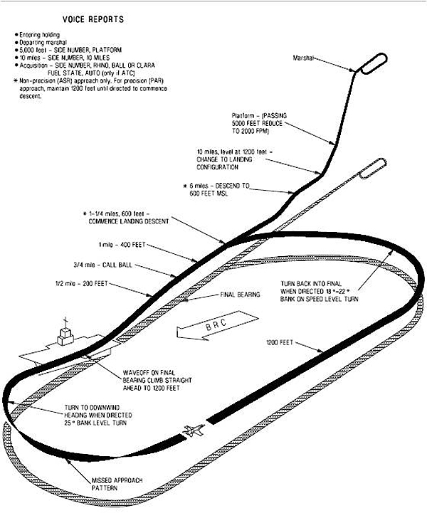 Note that each plane’s fuel state is added on at the end of a radio transmission because aircraft fuel state is one of the most critical pieces of information. Fuel states are tracked excruciatingly close by AIROPS and pilots are normally asked to “update state” every ten minutes. Many times a carrier may not be within range of a suitable divert airfield, meaning the only place to land is the ship—this is referred to as “blue water ops.” Fuel is expressed in pounds because aircraft weight (basic aircraft weight plus fuel on board) determines the tension setting for the arresting gear. Prior to each aircraft landing, the tension for the arresting gear is adjusted to the maximum weight for that aircraft. Additionally, distances to divert airfields are referenced by the amount of gas required to fly there. If a pilot needed to divert, or “bingo”, he would depart the aircraft carrier pattern at the fuel state required to fly to that field.