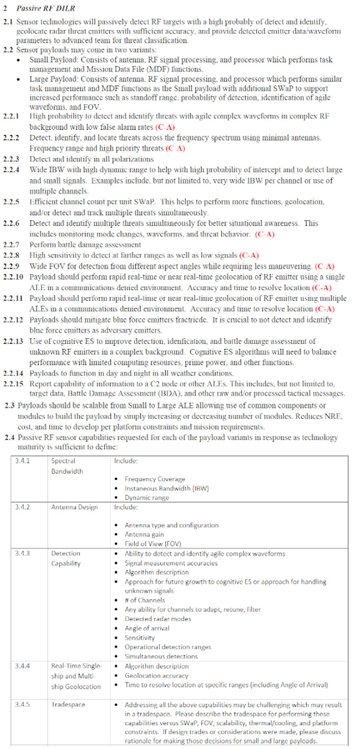 DILR ALEs will themselves fall into at least one of two categories, passive. The payloads on the passive types could include electro-optical or infrared imaging camera or sensors to detect and geolocate an opponent’s electromagnetic emissions from their communications systems, radars, or other signal emitters.