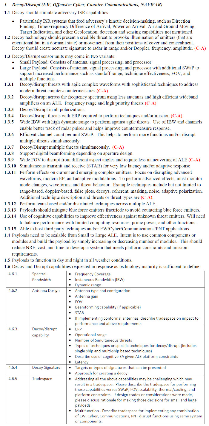 The Army’s ALE request for information lumps a wide array of electronic mission sets in a broad category described as “decoy/disrupt.” This includes systems that would enable the drones to act as decoys to confuse enemy air defenses, as well as launch a variety of electronic warfare, cyber warfare, and navigation warfare attacks. The latter category includes jamming and spoofing signals from space-based systems responsible for navigation, weapon guidance, and other related functions, such as the U.S. GPS satellite constellation or Russia’s GLONASS.