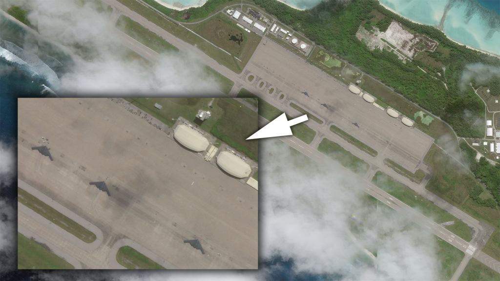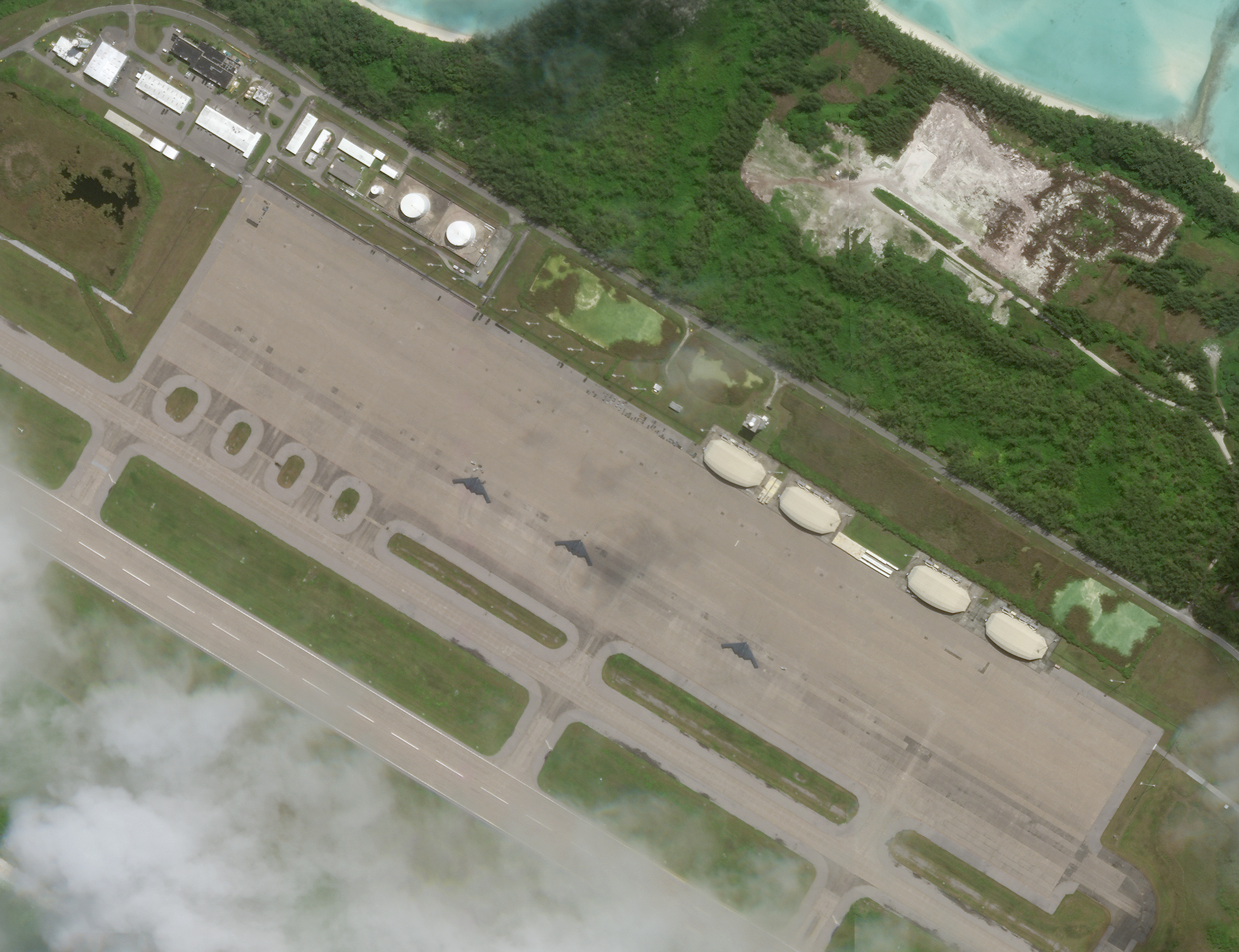 The remote airfield, which was a bustling hive of activity during the first decade of the Global War On Terror, is a far quieter place today. Still, it has seen a small resurgence in heavy bomber use as of late, with B-52s being sent there as a backstop against potential Iranian aggression last Winter. Now Diego Garcia”s huge parking apron has received three of its most prized, but temperamental patrons, ones which have their own special “VIP” climate-controlled clamshell shelters along the edge ramp that sit ready and waiting should the bombers have to use them in a crisis, or in this case, a deployment.