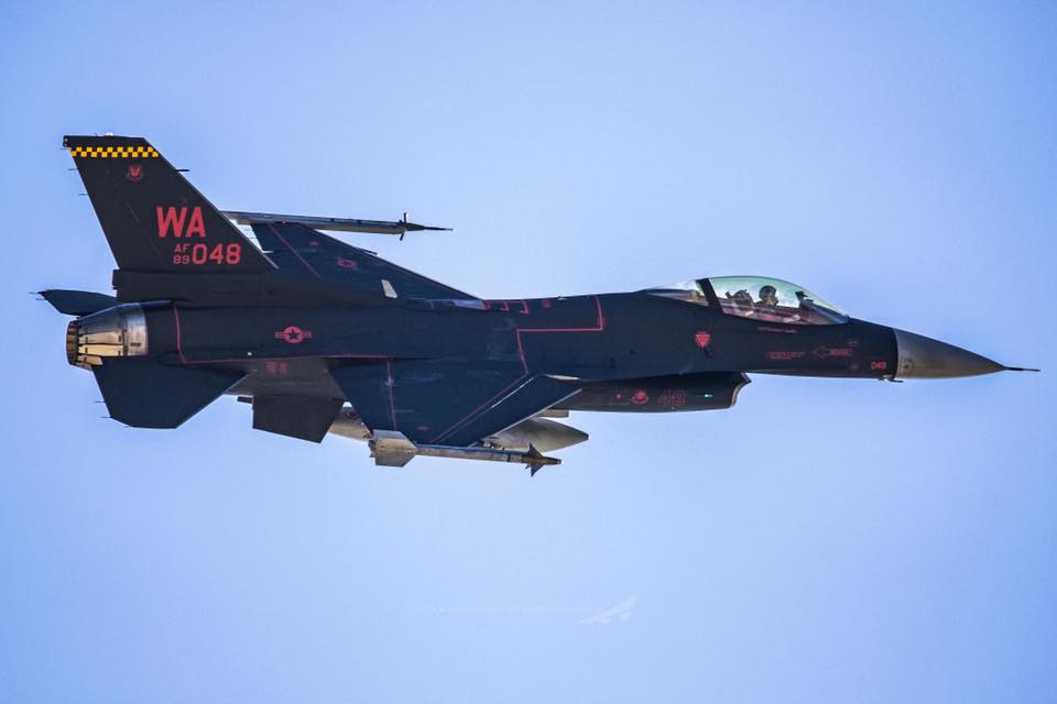 Some areas of the jet have not been repainted including the radome and various antennas associated with the Typhoon’s Defensive Aids Sub-System (DASS). The scheme has been described as a dark shade of gray, but appears closer to black, and is superficially similar to the “Blackbird-style” paint job that has been used by Nellis Air Force Base’s 64th Aggressor Squadron (AGRS) flying F-16s in Nevada.