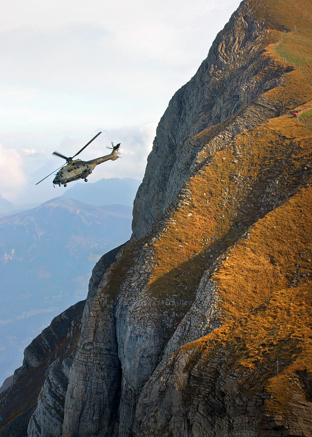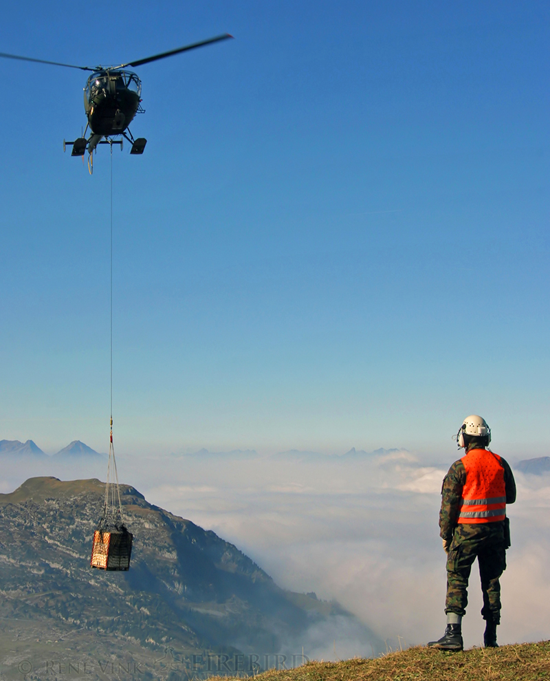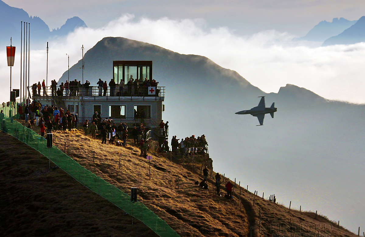 Getting to there is easy for the many VIPs and military personnel ferried by helicopter from nearby Meiringen Airbase to the observation station atop the range. Many others go on foot, though, which involves an intense three hour hike. As an aviation photographer for seventeen years, I have scaled the hills to Axalp five times since 2003. The photos in this piece are among the many photos I shot there.
