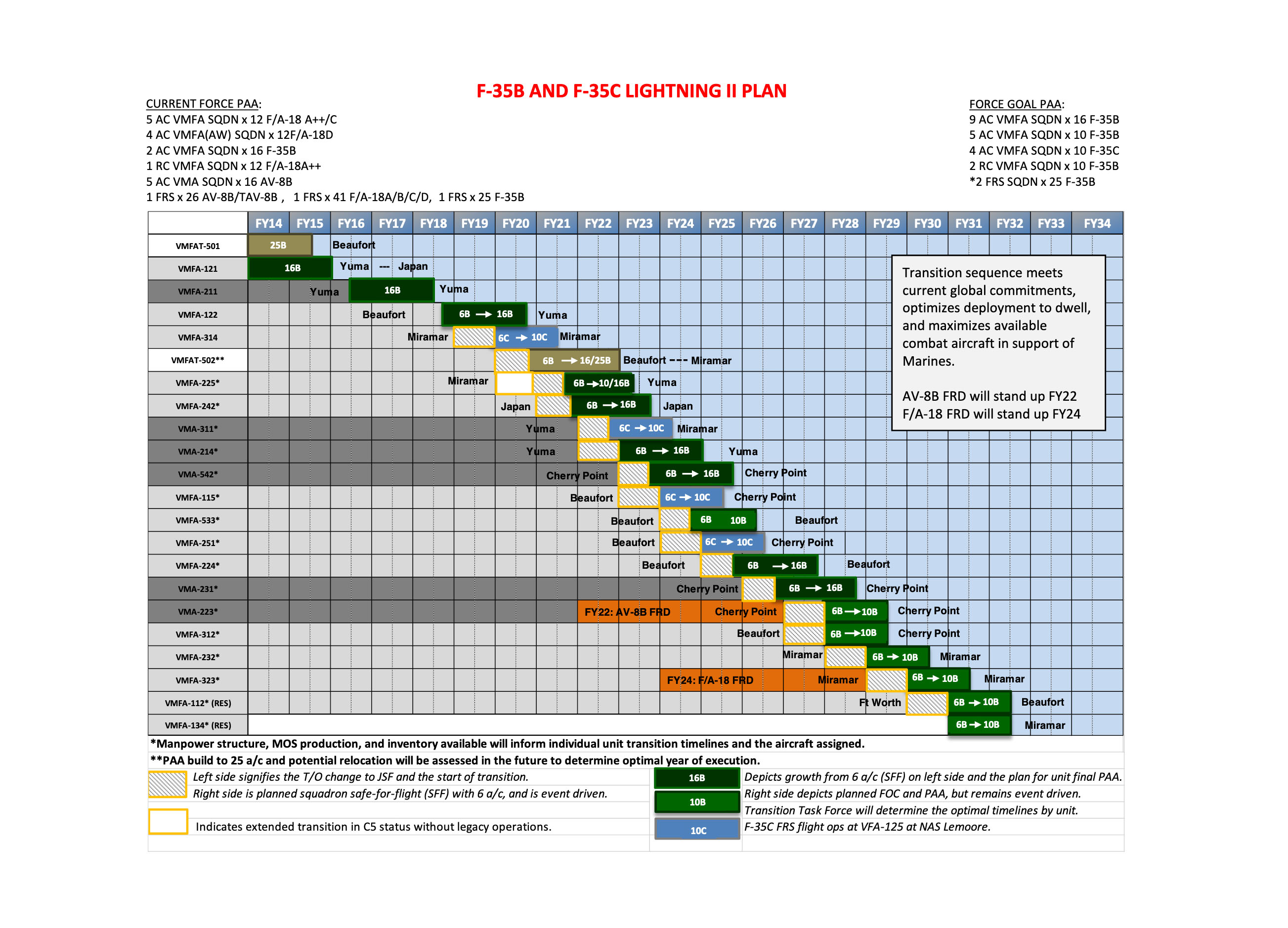 The USMC’s Hornet squadrons have struggled over recent years with readiness — having sufficient available airframes to meet commanders’ requirements. According to the 2018 Marine Aviation Plan: “The USMC fleet currently has eleven active squadrons and one reserve squadron. In recent years there has been an aircraft inventory shortage due to In Service Repairs (ISR) and depot maintenance backlog. HQMC has reset the force by temporarily reducing squadron flightline entitlement (FLE) to 10 aircraft to preserve future combat readiness while meeting today’s current operational requirements. As inventory continues to recover we will return to a community FLE of 12 with deploying squadrons beginning in 3rd quarter of FY17.”