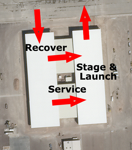 What’s the justification behind this conjecture? Well, it solves a number of problems with scaling up testing of large swarms of unmanned combat air vehicles. First off, servicing and then staging the aircraft for a mission requires a lot of space and would benefit more by a production line-like arrangement than a traditional hangar and apron layout. The modifications are fairly ingenious as the arrangement would allow for a large group on drones to park outside of the view of satellites and out of the weather on one side, with the hangars in the center working as pass-through servicing bays for preparing them for another flight, and then moving them to the other side to await a launch en-masse on their next mission. Upon return, they would be parked on the other side once again and await servicing and staging for reuse. Just learning how to best stage, launch, and recover a large number of semi-autonomous jet-powered unmanned systems together will surely be a focus of any such program.