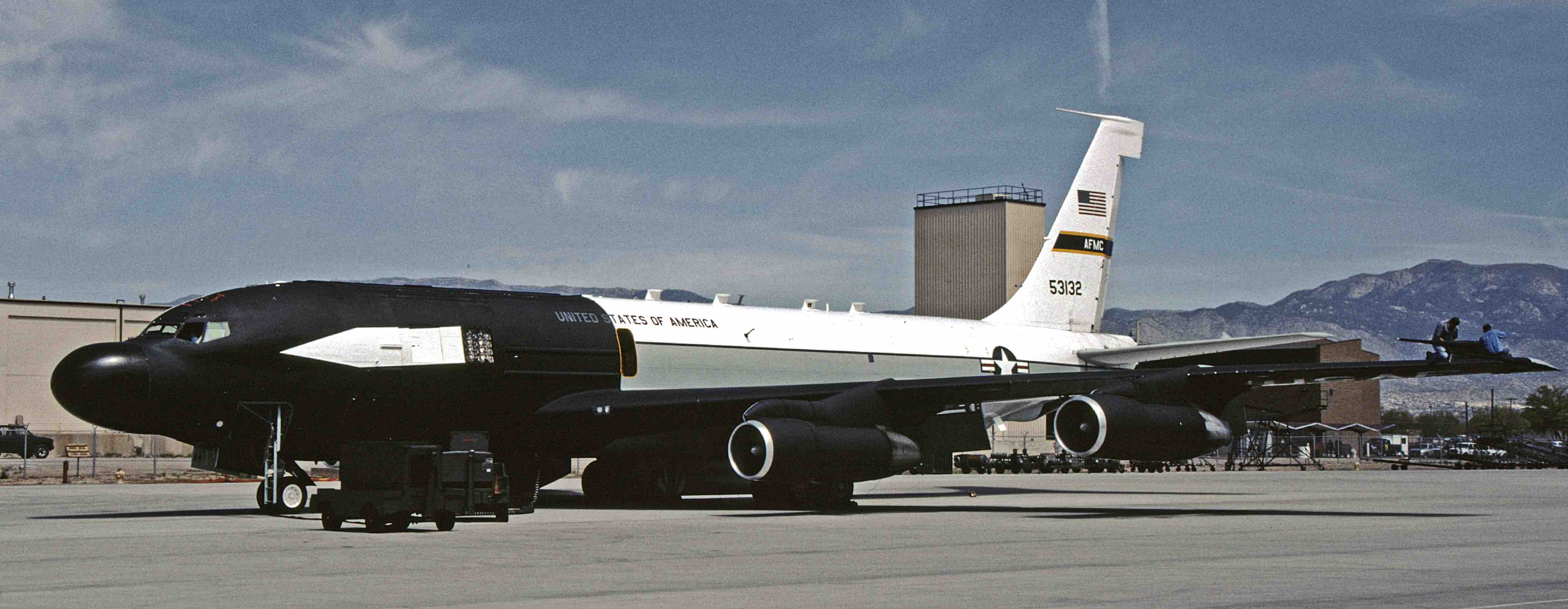 Moreover, the four TF33 engines could not produce enough electricity to power the radar, so a Lycoming T55 engine was mounted in a pod beneath the left wing, and a heat exchange pod was installed under the right wing to dissipate the 1 million BTUs of additional heat generated by the radar. This gave rise to spurious claims of a “six-engine RC-135.” A fiberglass radome covered half of the fuselage over the radar, but it was not wrap-around, as some have claimed.