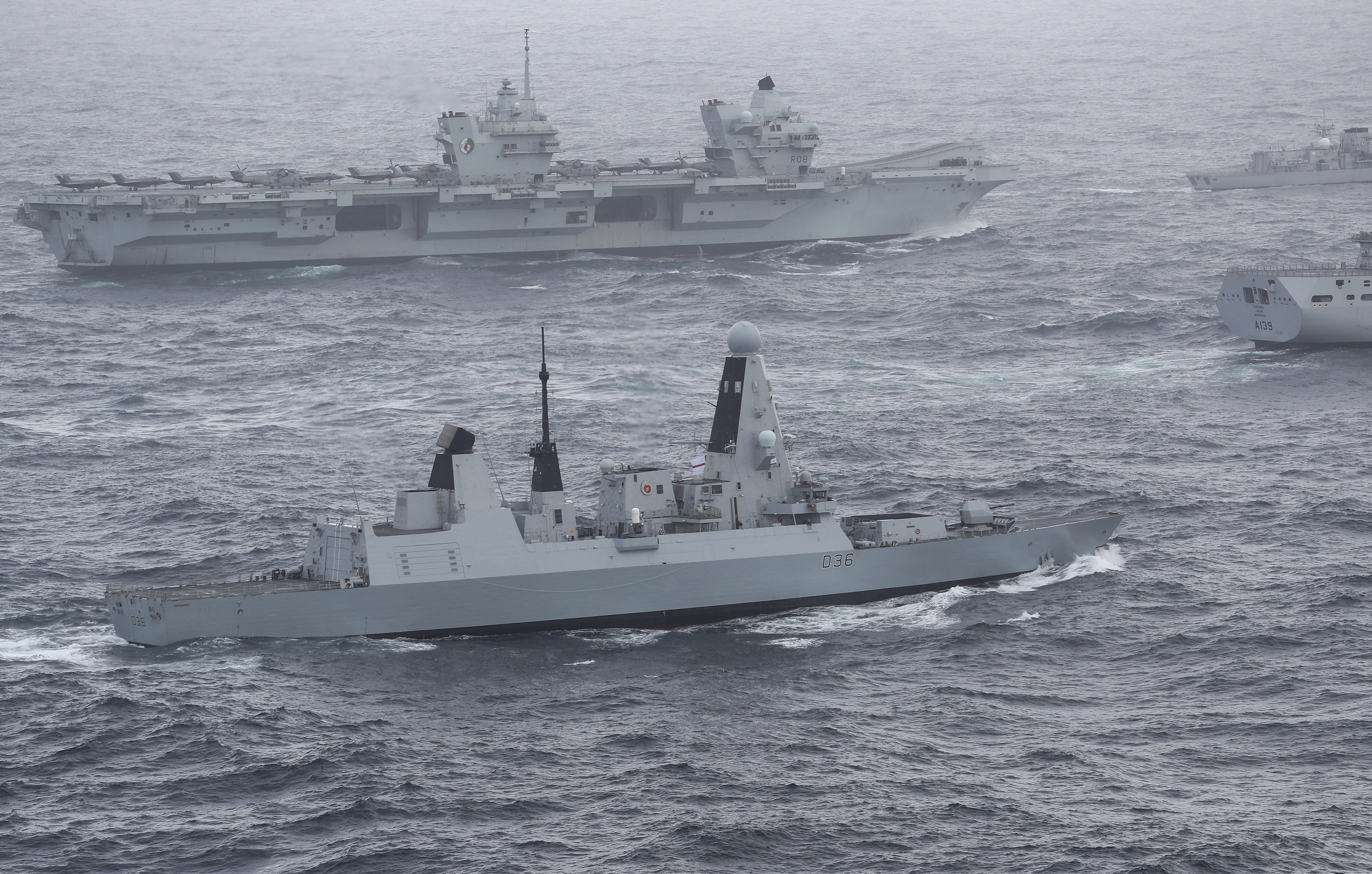 The Royal Navy describes the Carrier Strike Group as “the largest and most powerful European-led maritime force in almost 20 years.” It’s certainly an impressive task group, including two of the Royal Navy’s Type 45 destroyers — HMS Diamond and HMS Defender. The primary role of the Type 45s is air defense, for which they are equipped with Sampson active electronically scanned array radar and Sea Viper missiles, providing a protective umbrella around the carrier.