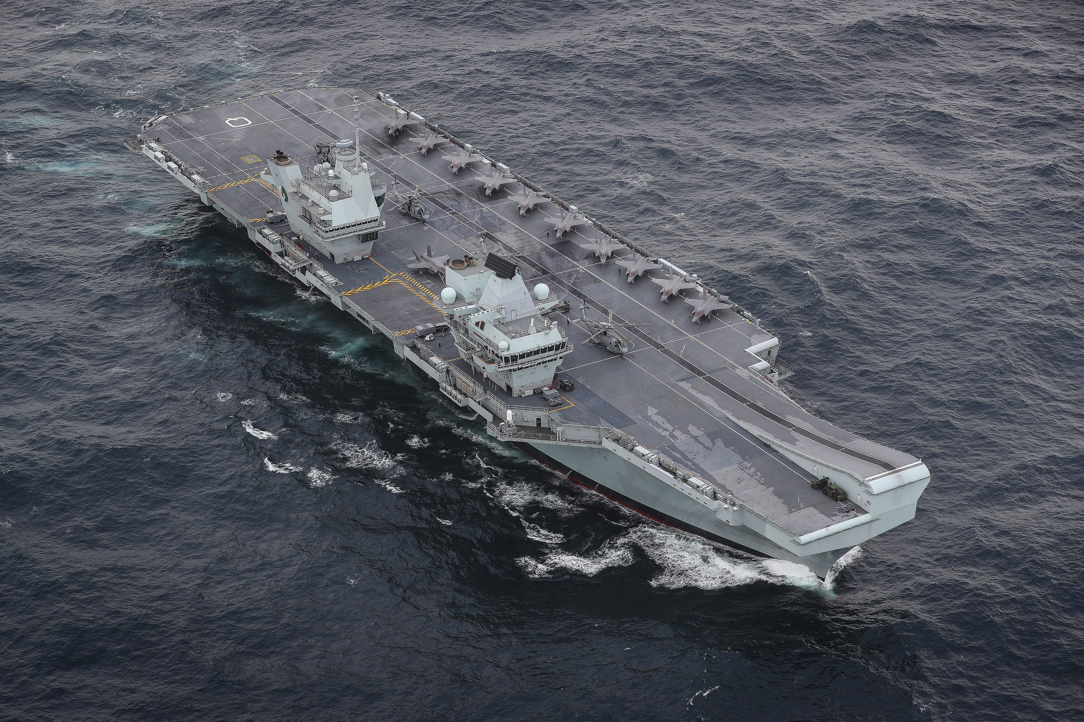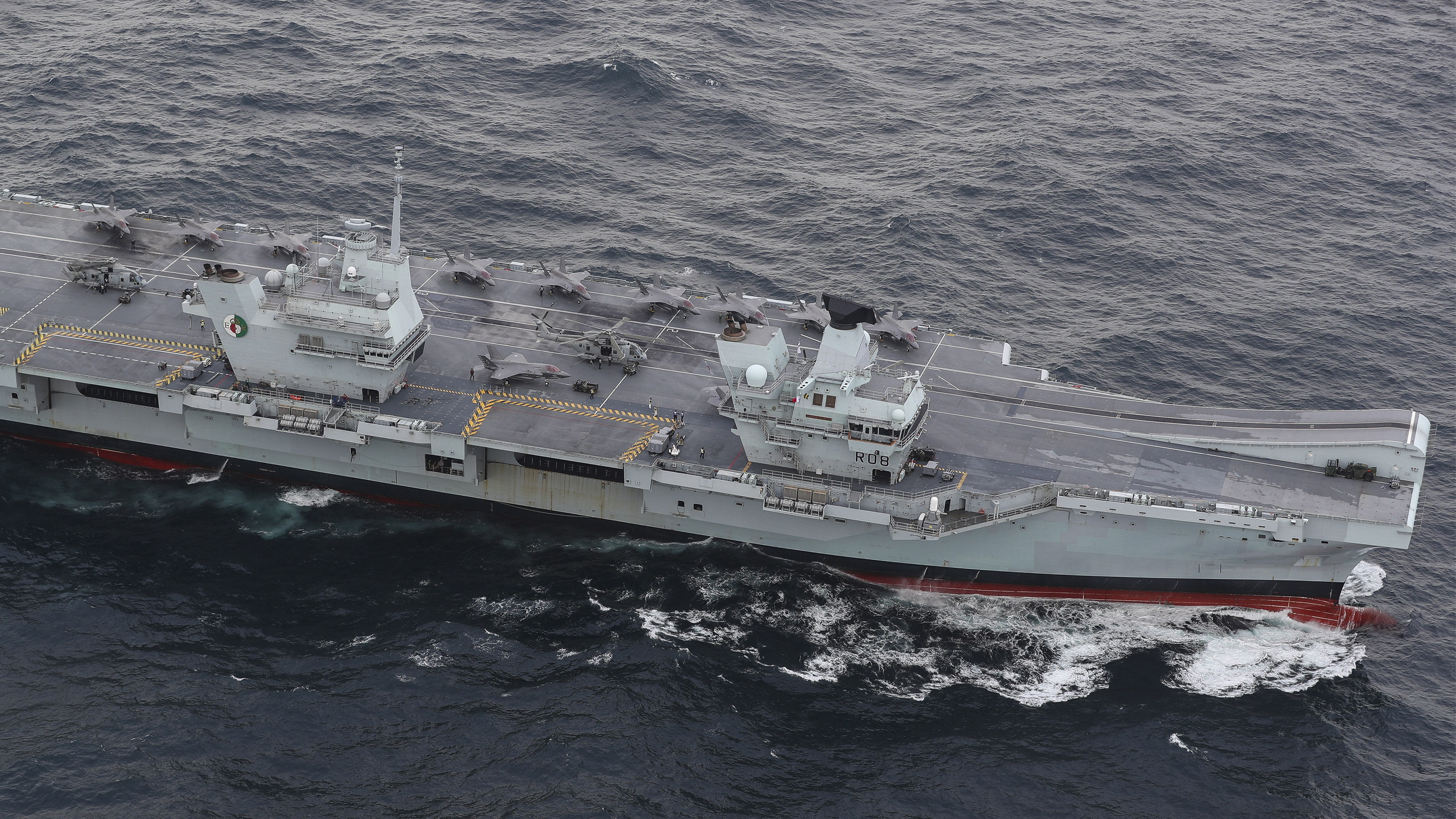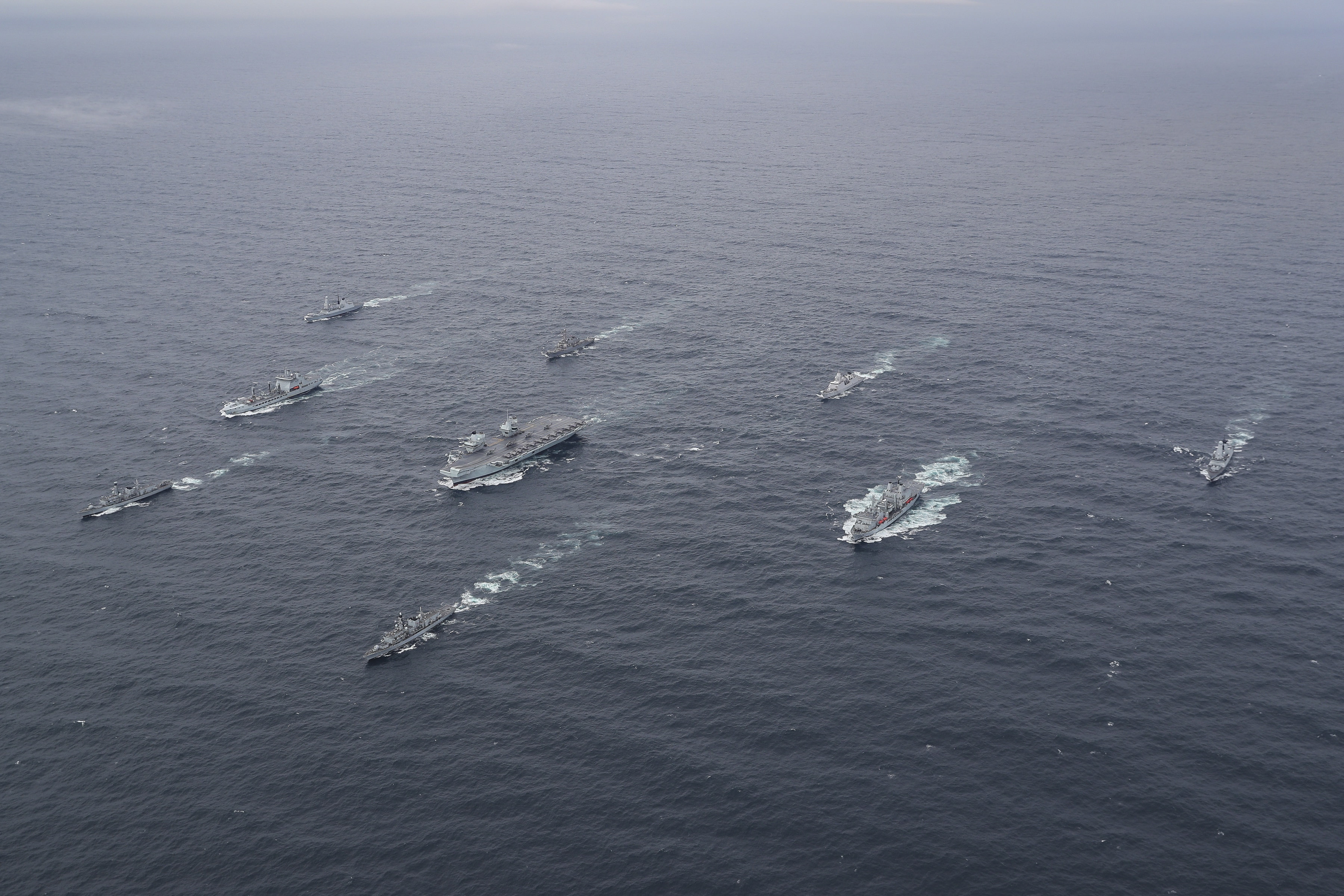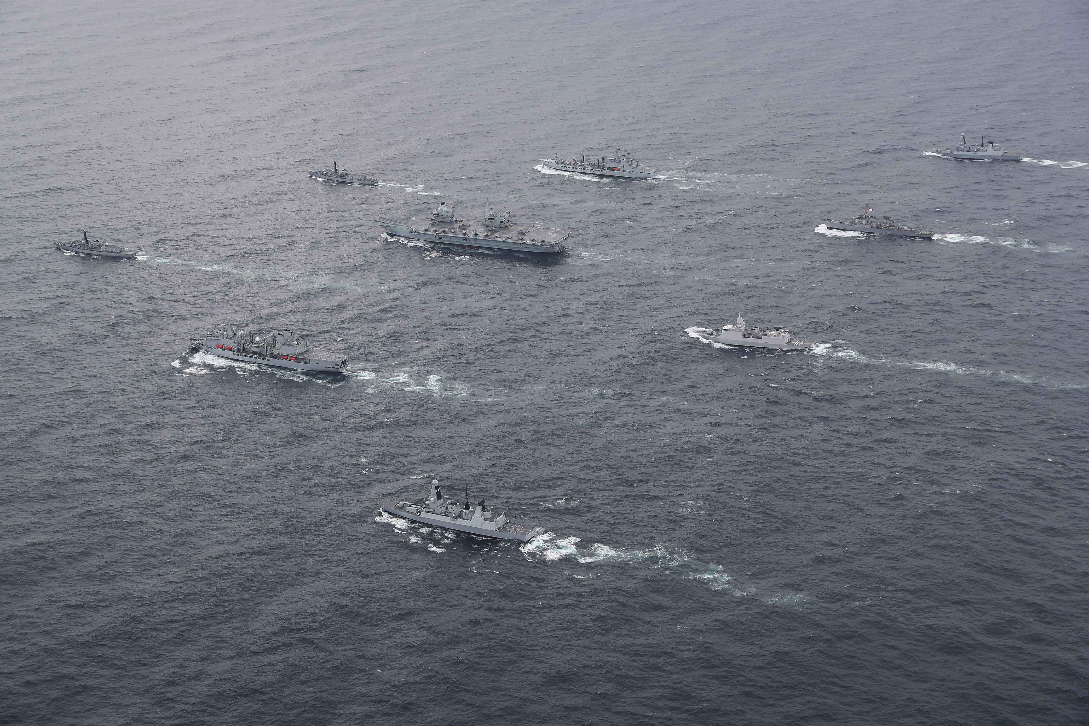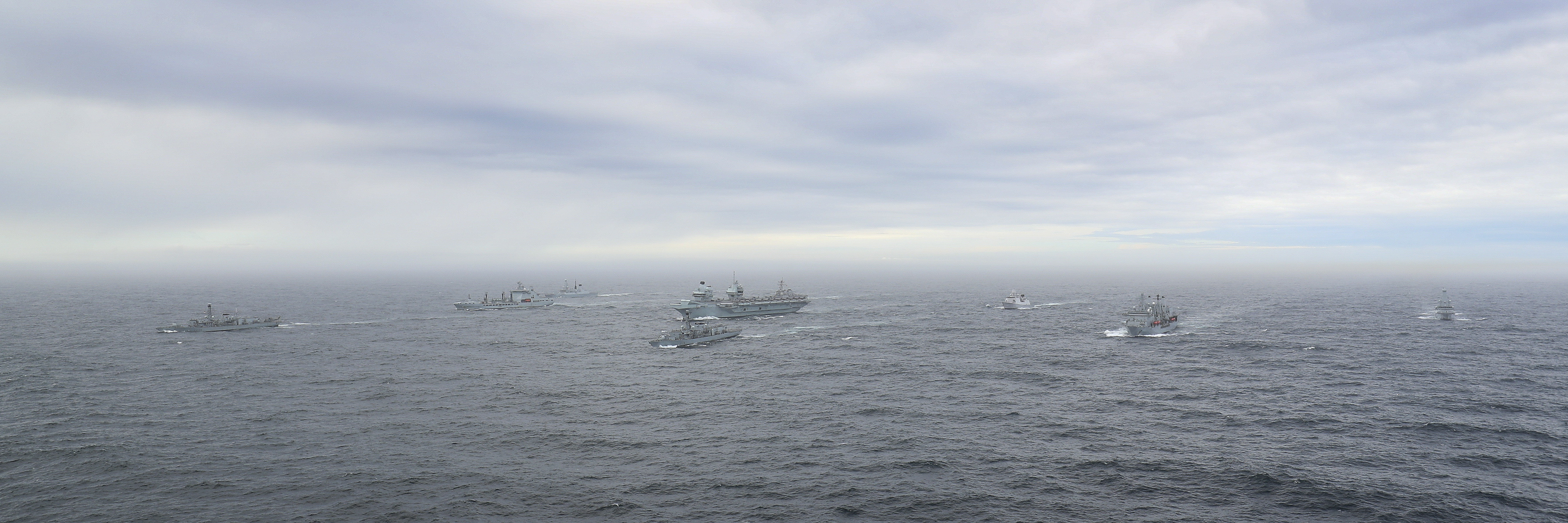 Below the waves, at least one submarine — almost certainly a Royal Navy Astute-class nuclear-powered attack boat — is accompanying the Carrier Strike Group. The presence of this tenth vessel was confirmed by a previous disclosure from the official Twitter account for the aircraft carrier.