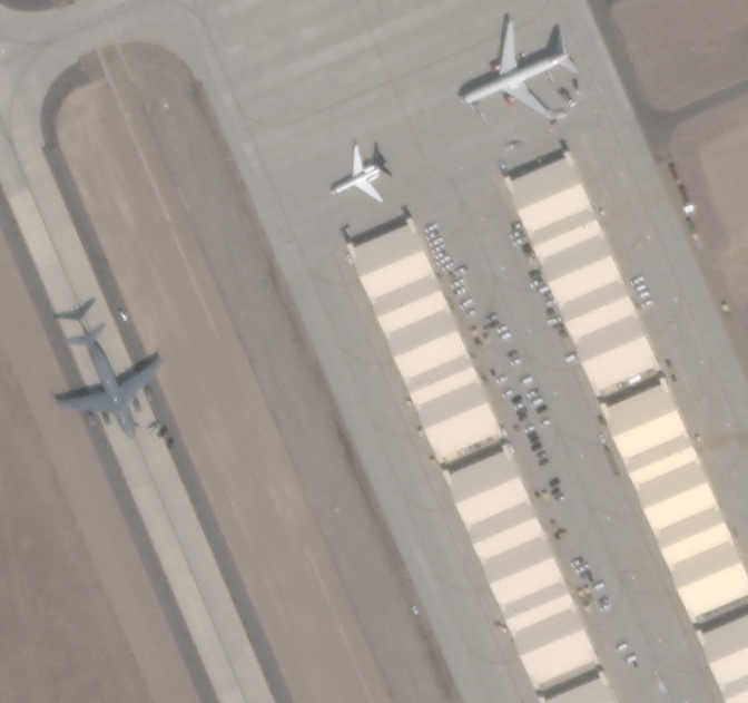 The center of the action lies near the central ‘canyon’ of hangars, all of which were originally built for, at the time, the very secretive F-117 Nighthawk program. A very large number of vehicles have congregated in the canyon, most near the westernmost row of hangars. These hangars seem to have some association with the special operations community and often have transport aircraft, Black Hawk helicopters, CN-235s, and other airframes associated with that community parked nearby.