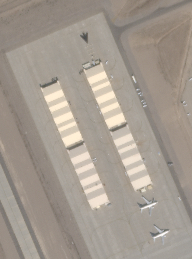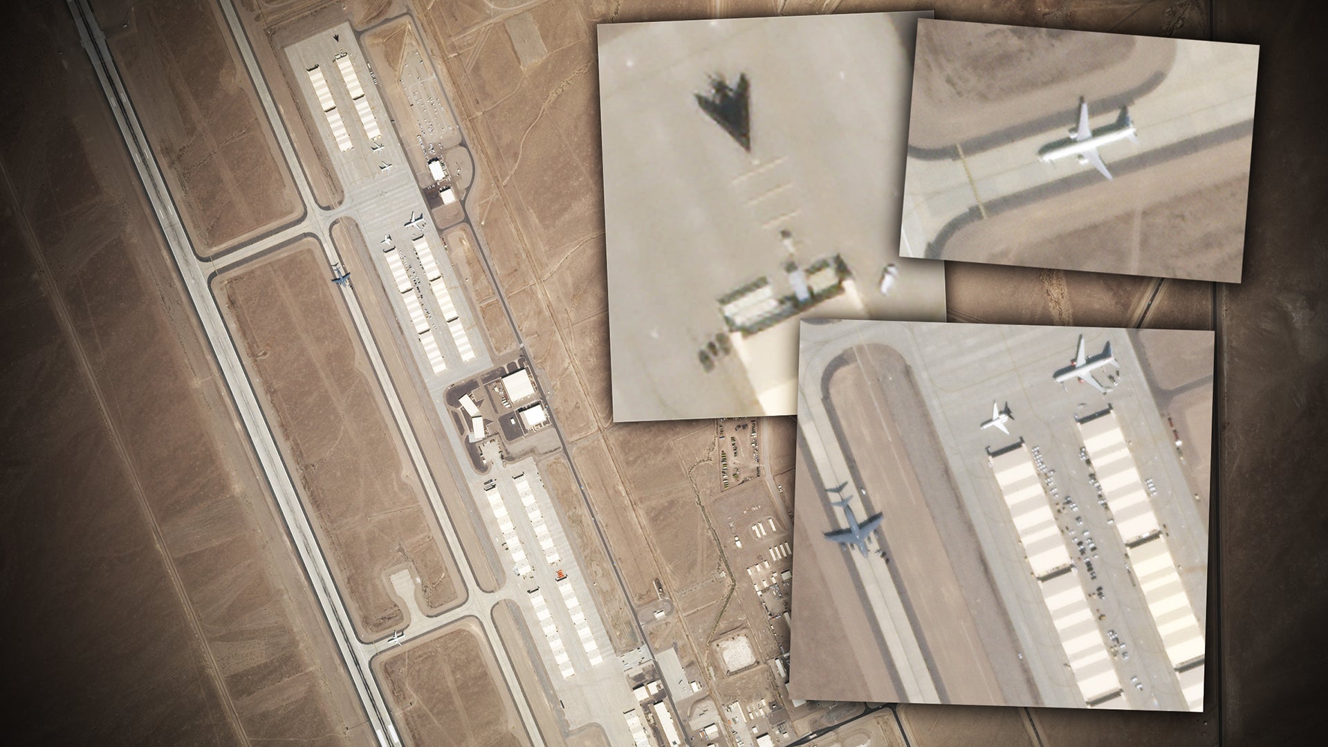 To the north, we see Tonopah Test Range Airport’s most famous tenant, an F-117 Nighthawk. It’s rare to see the stealth jets in high-resolution satellite imagery at all, even though they are now very active. But in this case, we don’t only get to see one of them, it appears that a photoshoot was underway when the satellite was passing over. It looks like people are aligned in rows in a delta formation in front of the jet for the picture, with an elevated platform capturing it the front of the formation. The lighting would have been absolutely perfect for this shot and the positioning keeps the lens away from the base’s sensitive operating areas.