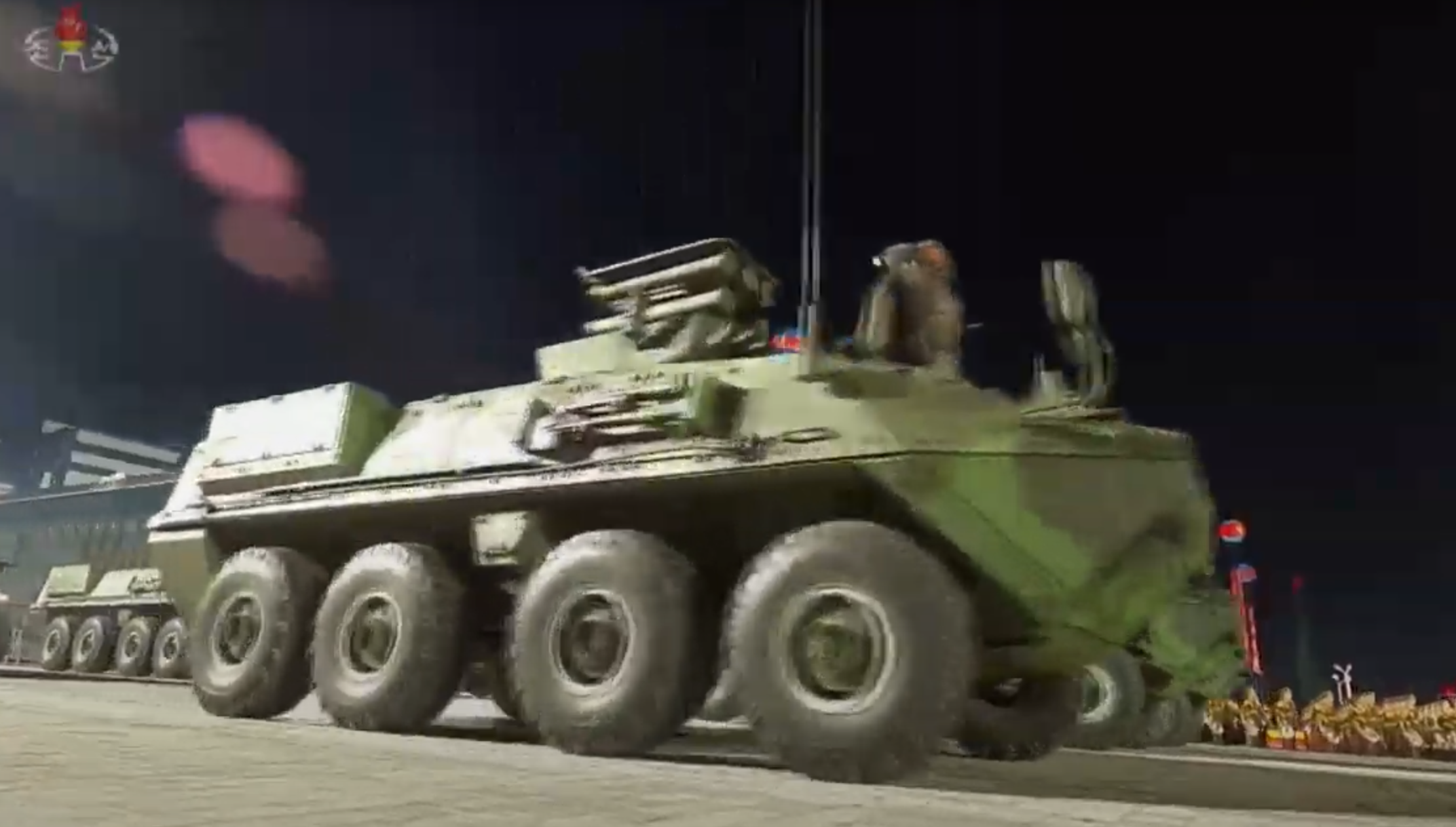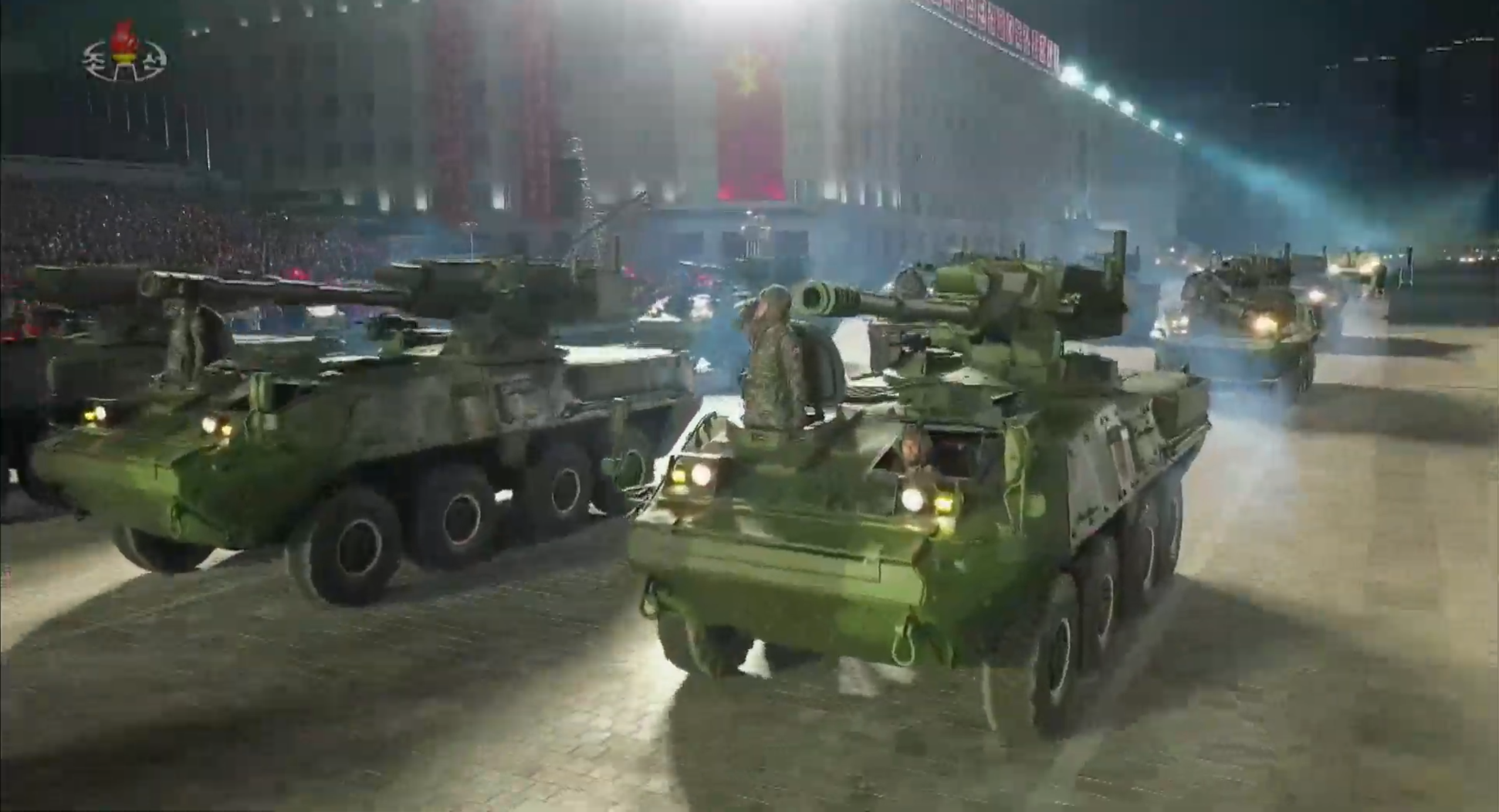 An 8×8 wheeled mobile gun system also made an appearance. This is an entirely new capability for North Korea and allows for higher-speed mobility for a large direct-fire weapon compared to its tracked counterparts. Similar arrangements have become popular around the world, including in the U.S. with the M1128 Stryker Mobile Gun System.