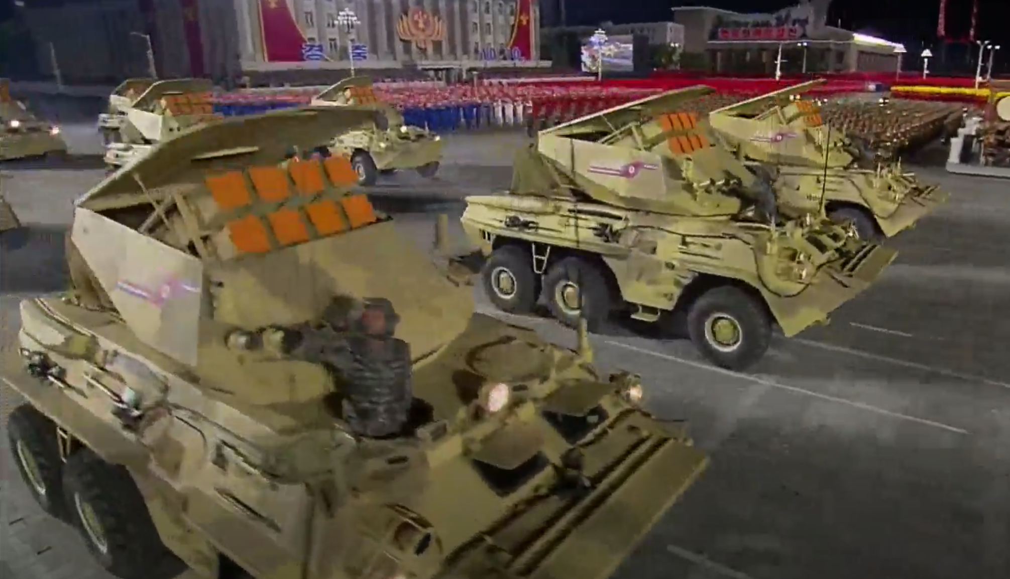 Another unveil was this wheeled armored vehicle that appears to feature an eight-round loitering munition launcher. This type of weapon is changing the battlefield as it can fly out to a target area, briefly surveil it, and then strike a target of opportunity with pinpoint precision. Israel largely pioneered this technology with their Spike NLOS series of weapons. North Korea seems to have taken note. Such a system is extremely relevant for combat operations along the DMZ.