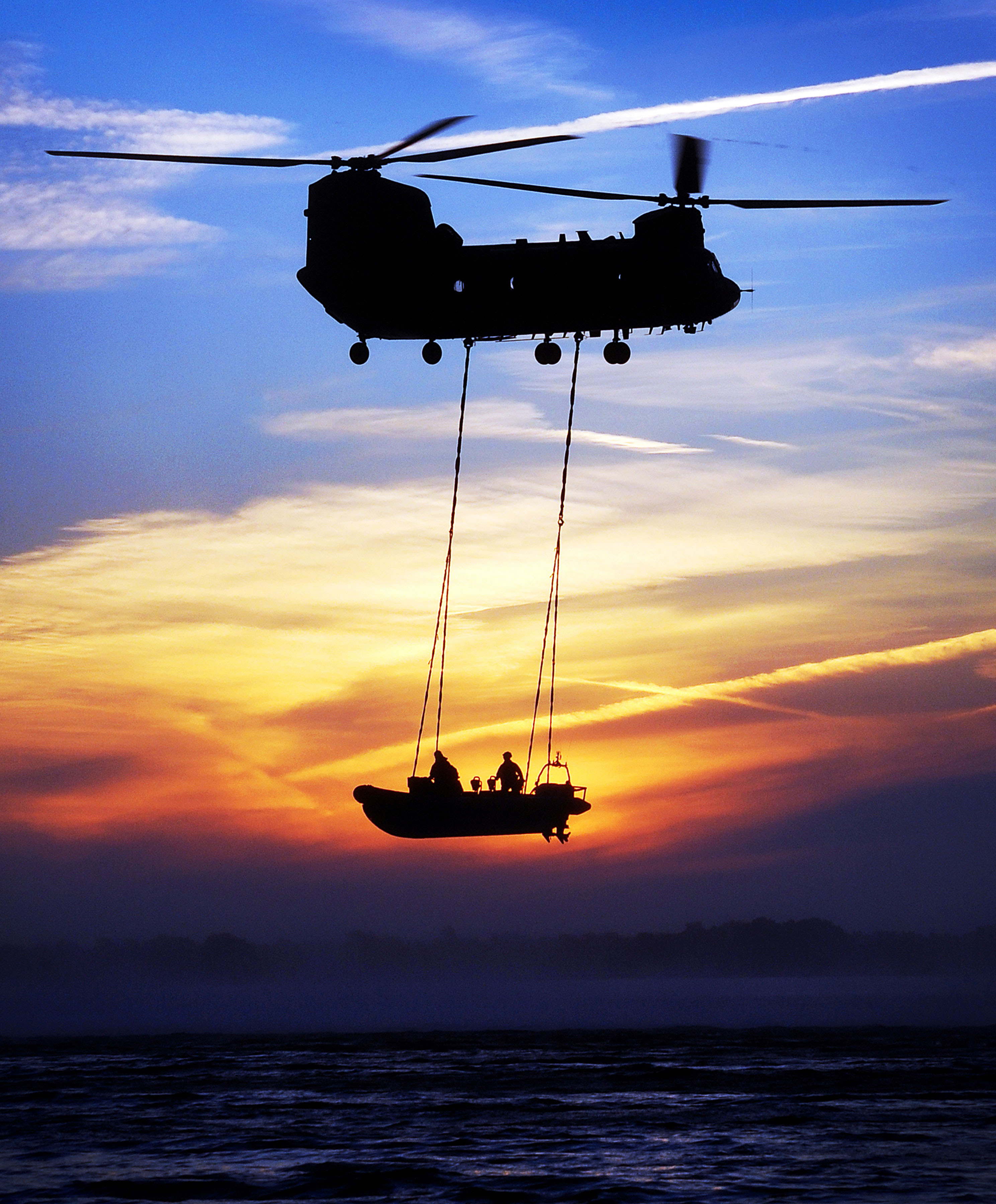 In addition to being flown into action aboard helicopters, the SBS also trains for “boat drop” operations, in which a Rigid Inflatable Boat (RIB) is delivered from the rear ramp of an RAF C-130J Hercules transport, followed by the SBS team, also descending under parachutes into the water below.