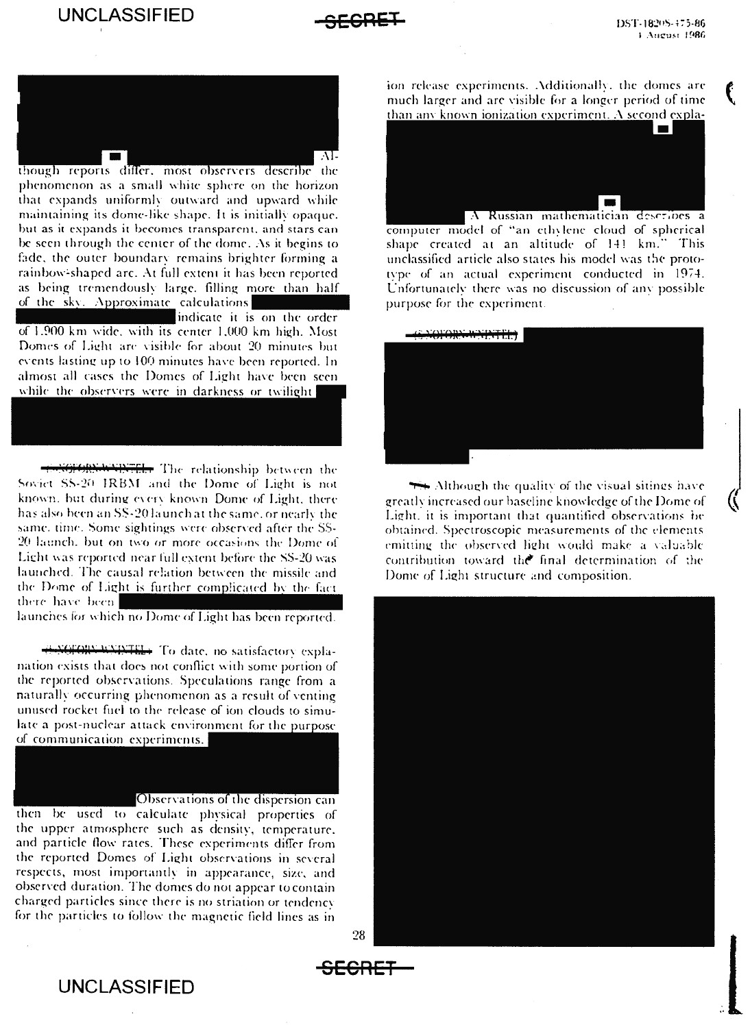 “Observations of the dispersion can then be used to calculate physical properties of the upper atmosphere such as density, temperature, and particle flow rates,” the unredacted portions of the report continue, offering additional details about the ion cloud theory. “These experiments differ from the reported Domes of Light observations in several respects, most importantly in appearance, size, and observed duration. The domes do not appear to contain charged particles since there is no striation or tendency for the particles to follow the magnetic field lines as in ion release experiments. Additionally, the domes are much larger and are visible for a longer period of time than any known ionization experiment.”