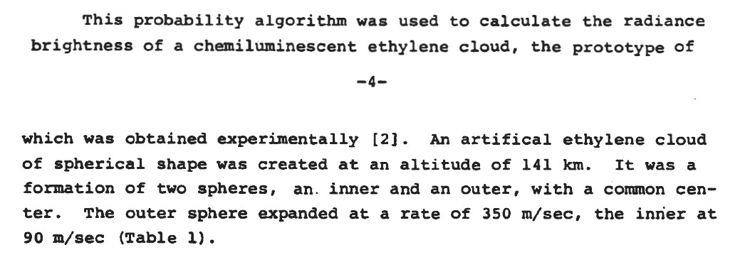 In addition to describing, theoretically, how one would go about creating this cloud, Slekenichs notably mentions that “this probability algorithm was used to calculate the radiance brightness of a chemiluminescent ethylene cloud, the prototype of which was obtained experimentally.” That sentence includes a footnote that cites another report, dated 1974.