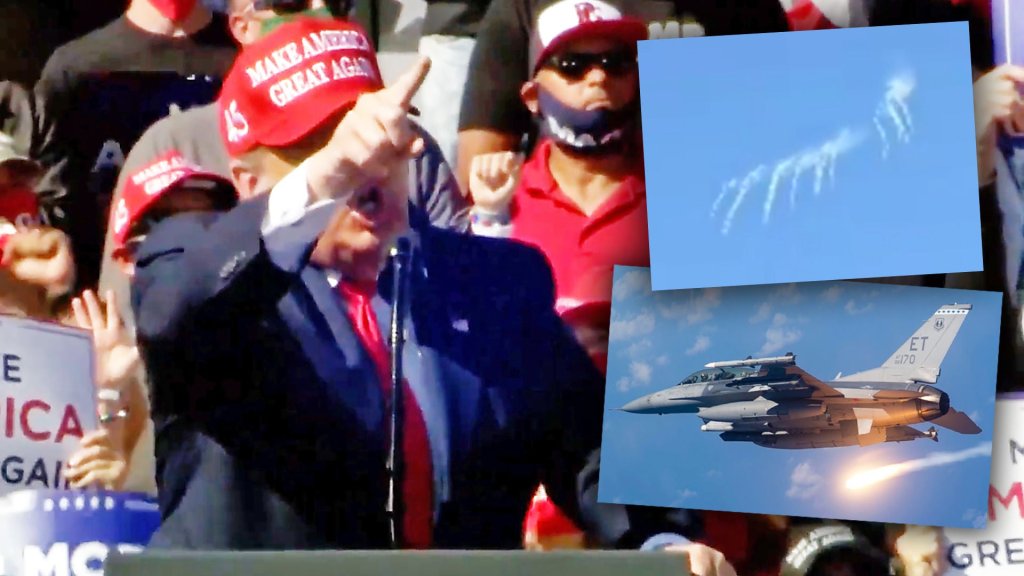 A U.S. Air Force F-16 Viper fighter jet fired off flares to get the attention of another aircraft that had flown into restricted airspace around where President Donald Trump has been holding a campaign rally in Bullhead City, Arizona. The exact circumstances remain unclear, but the other plane subsequently established radio communications with the fighter and was escorted out of the area without further incident.