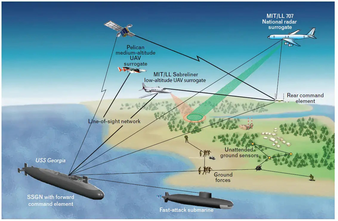 In 2004, the modified 707 had played the role of an airborne radar with synthetic aperture and ground-moving-target indicator capabilities during a U.S. Navy exercise nicknamed Silent Hammer, which helped prove out various concepts of operation related to that service’s converted Ohio class guided missile submarines. You can read more about those specialized boats in detail, as well as that transformational exercise, in this past War Zone feature.